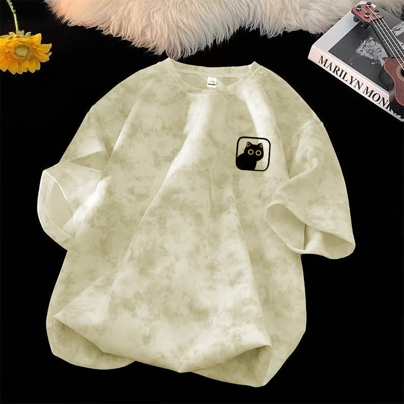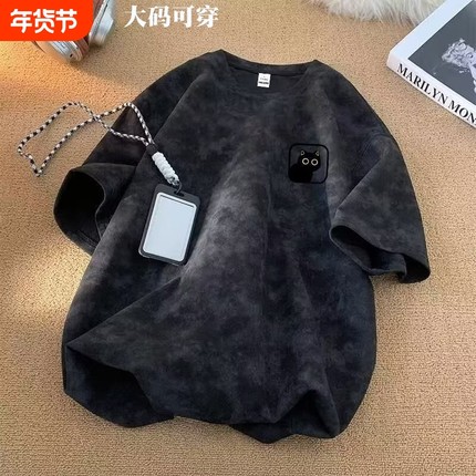 潮牌短袖t恤男女夏季扎染美式重磅宽松五分袖2025新款大码体恤衫