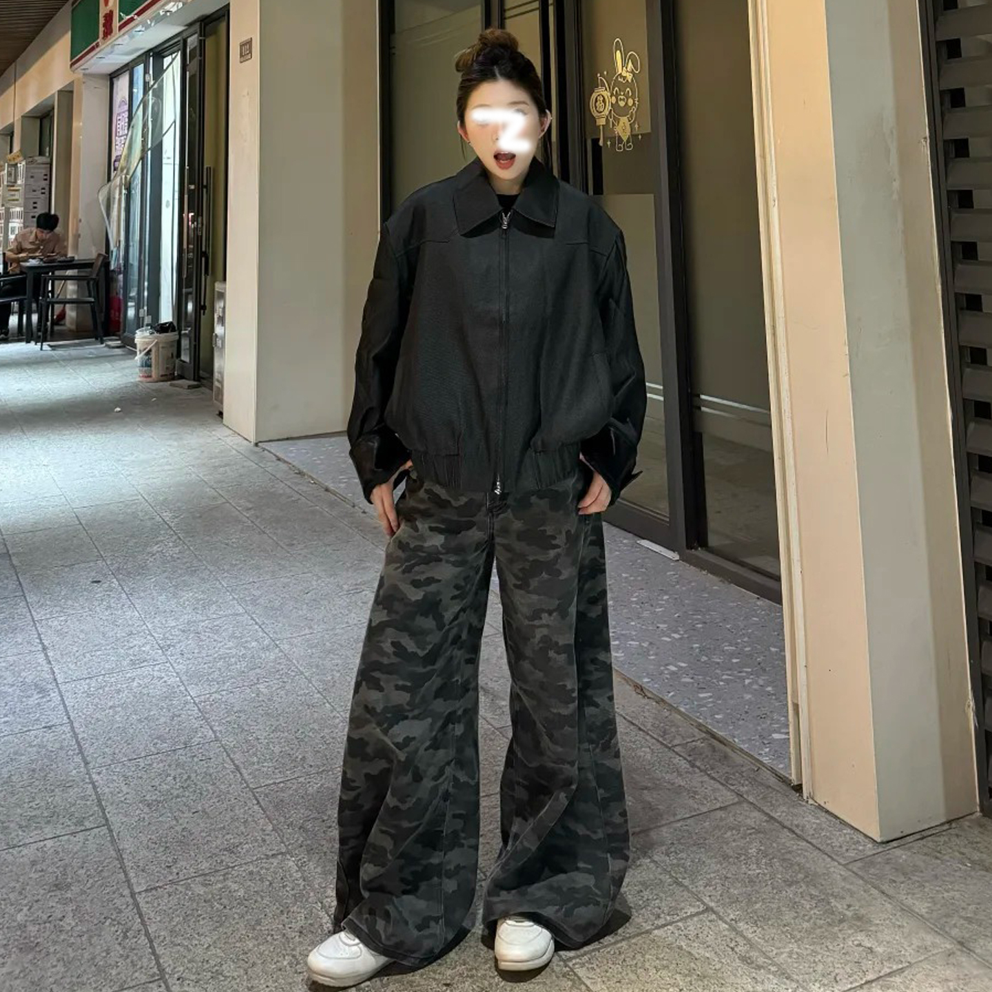 高个子加长美式复古迷彩工装牛仔裤女春秋新款高腰显瘦阔腿拖地裤
