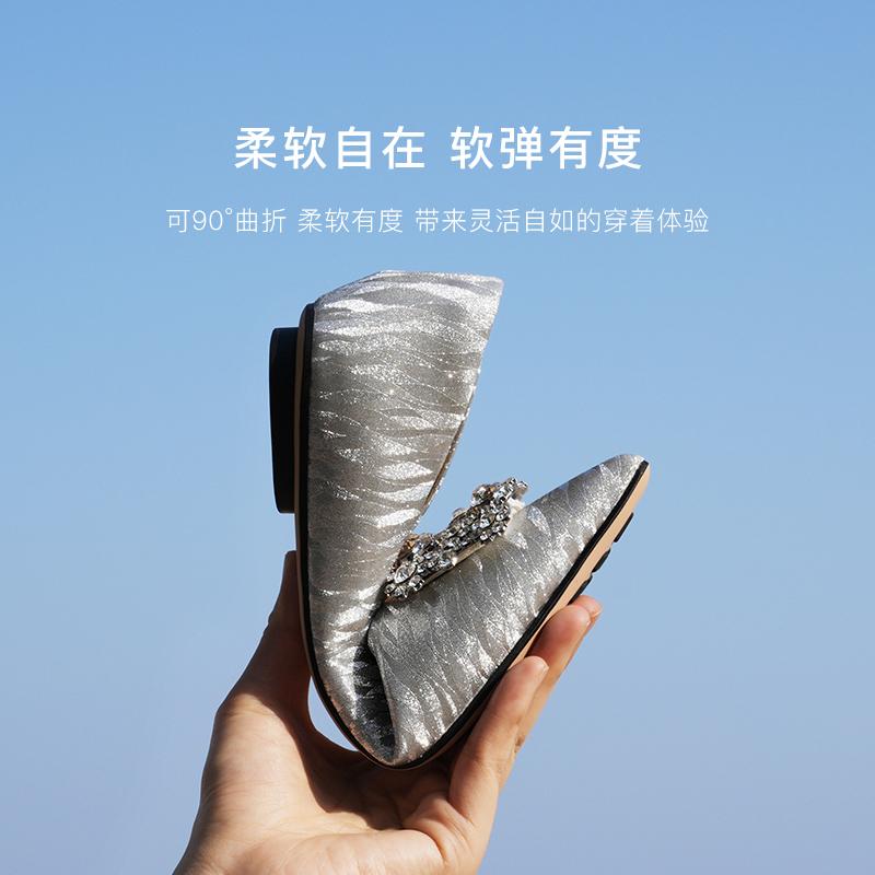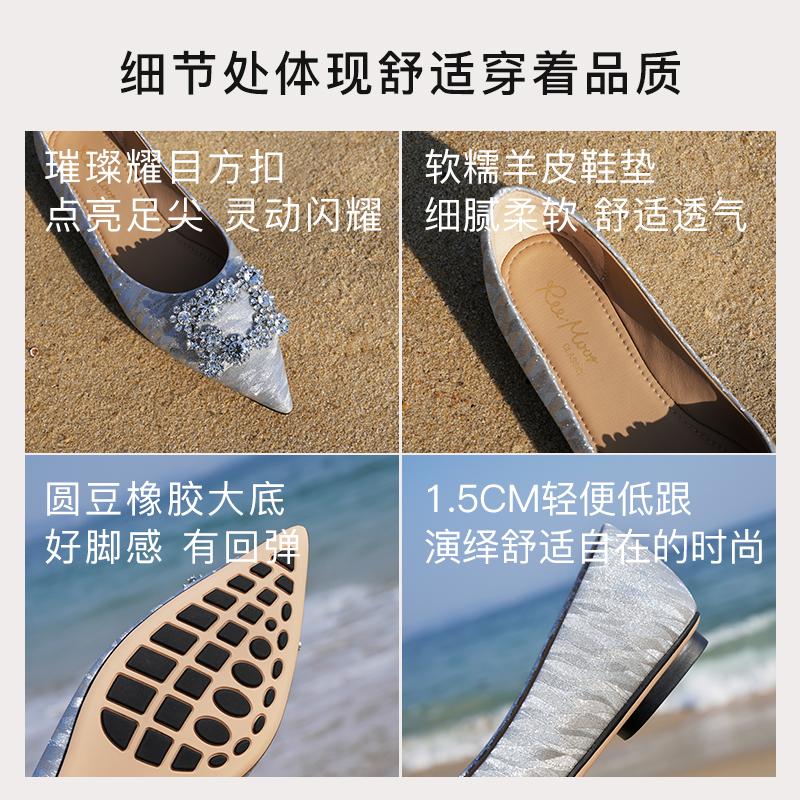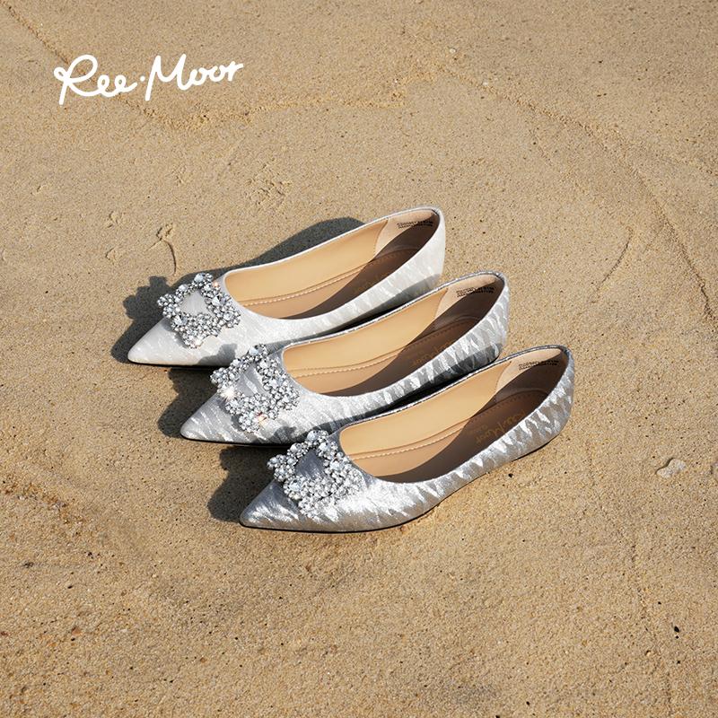 REEMOOR2025秋季新款法式尖头浅口单鞋水钻方扣平底鞋女婚鞋