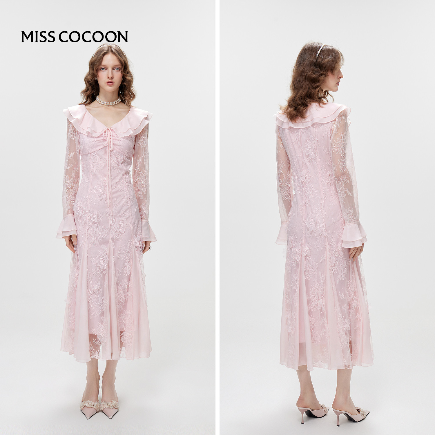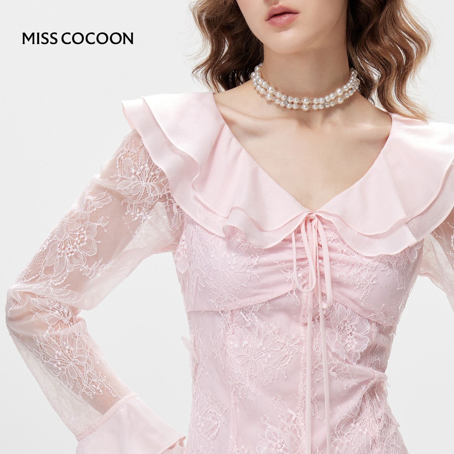MISSCOCOON可可尼蕾丝刺绣长裙女26春新款荷叶边系带粉色连衣裙