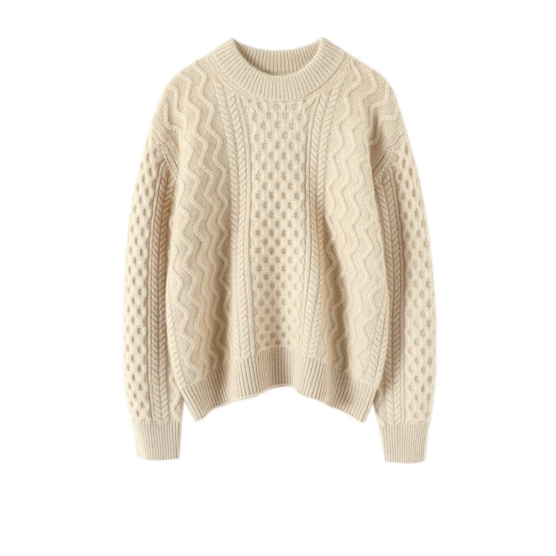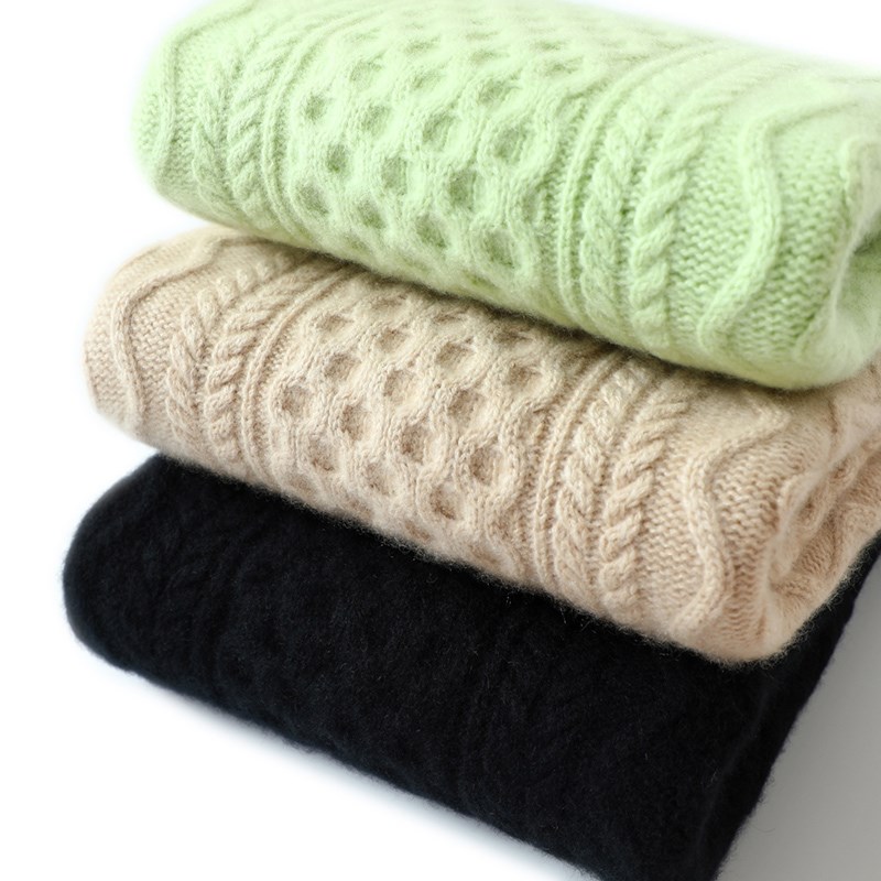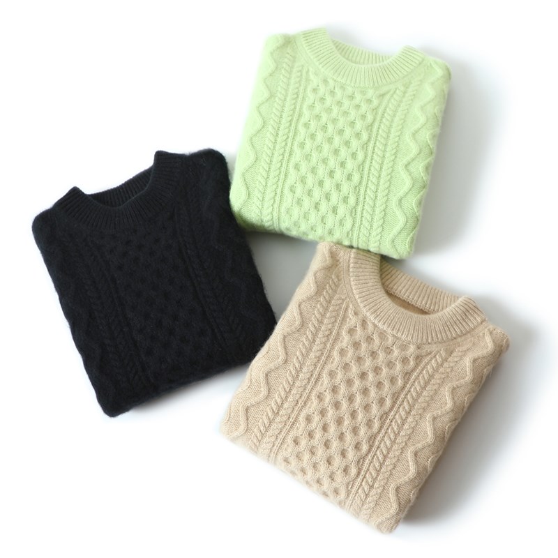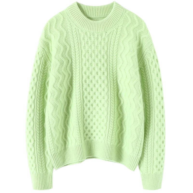 那么暖!那么潮!牛油果绿绞花A圆领羊绒衫女加厚纯羊绒毛衣宽松