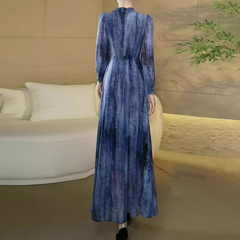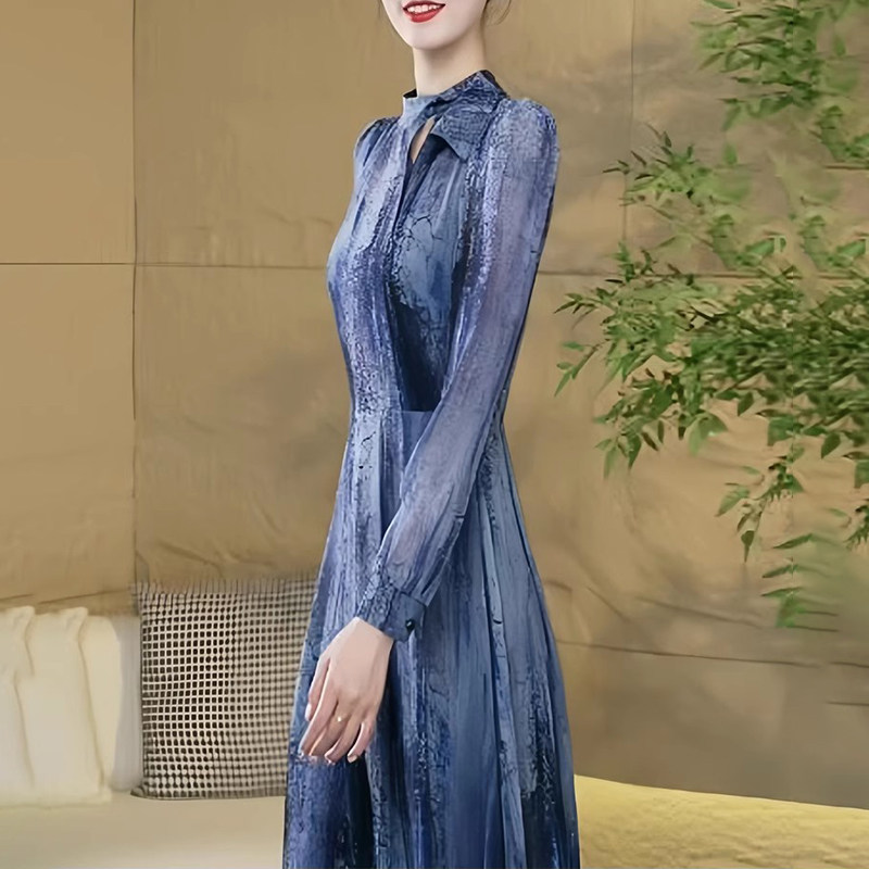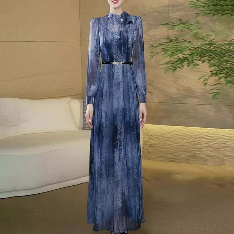 秋装新款名媛气质高级感真丝桑蚕丝连衣裙水墨印花修身大摆长裙子