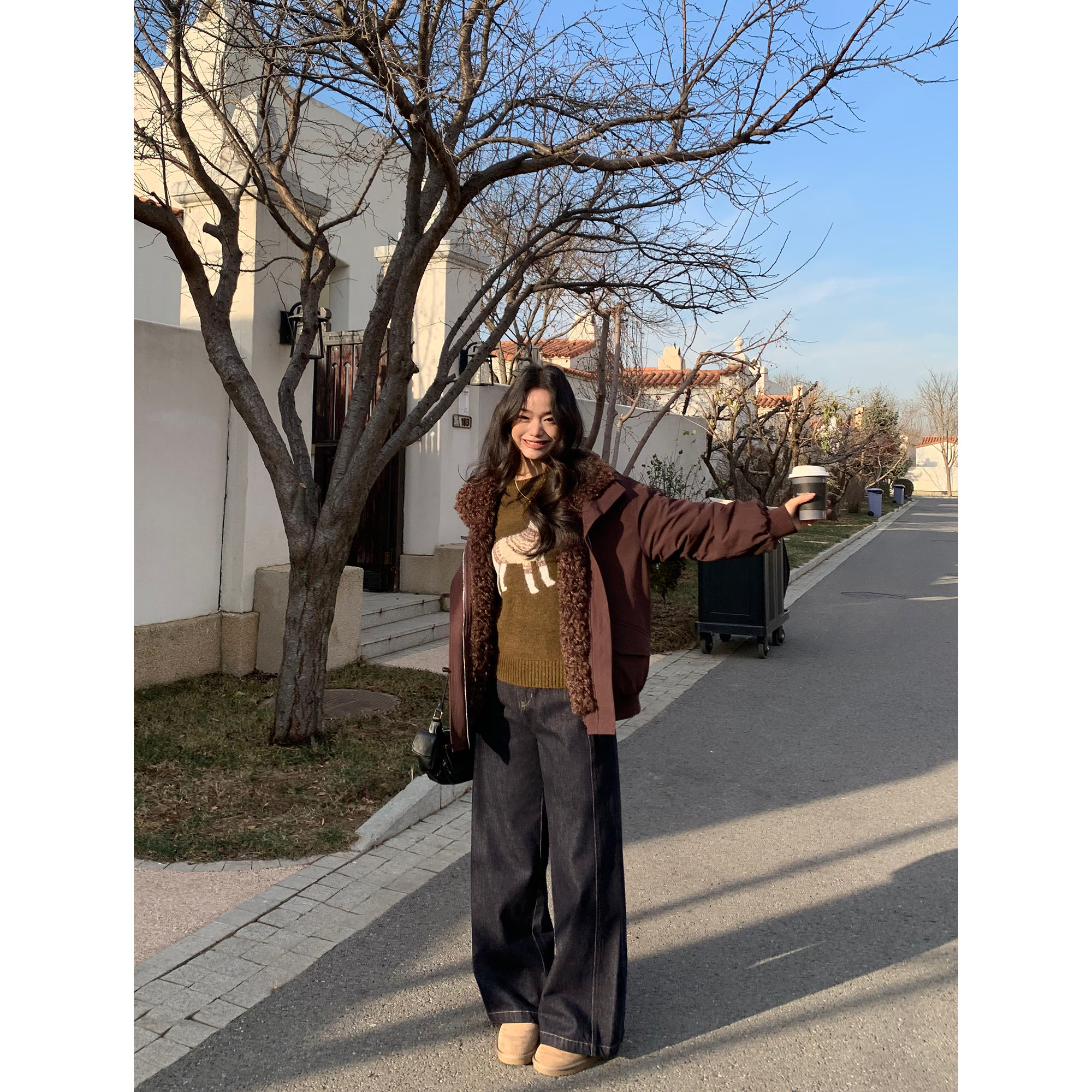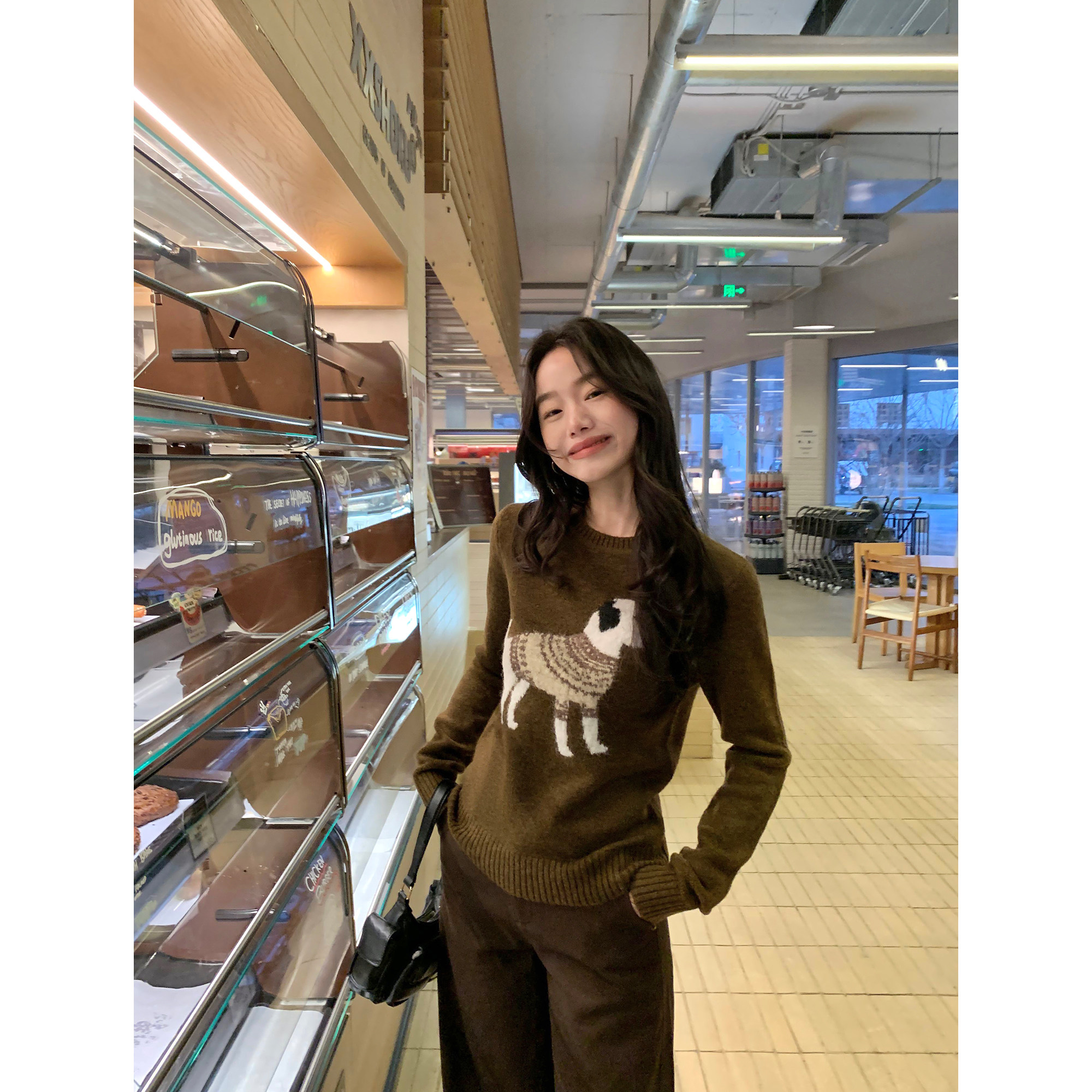 pusumede 时髦玩味 小狗提花圆领毛衣女小众保暖宽松套头针织上衣