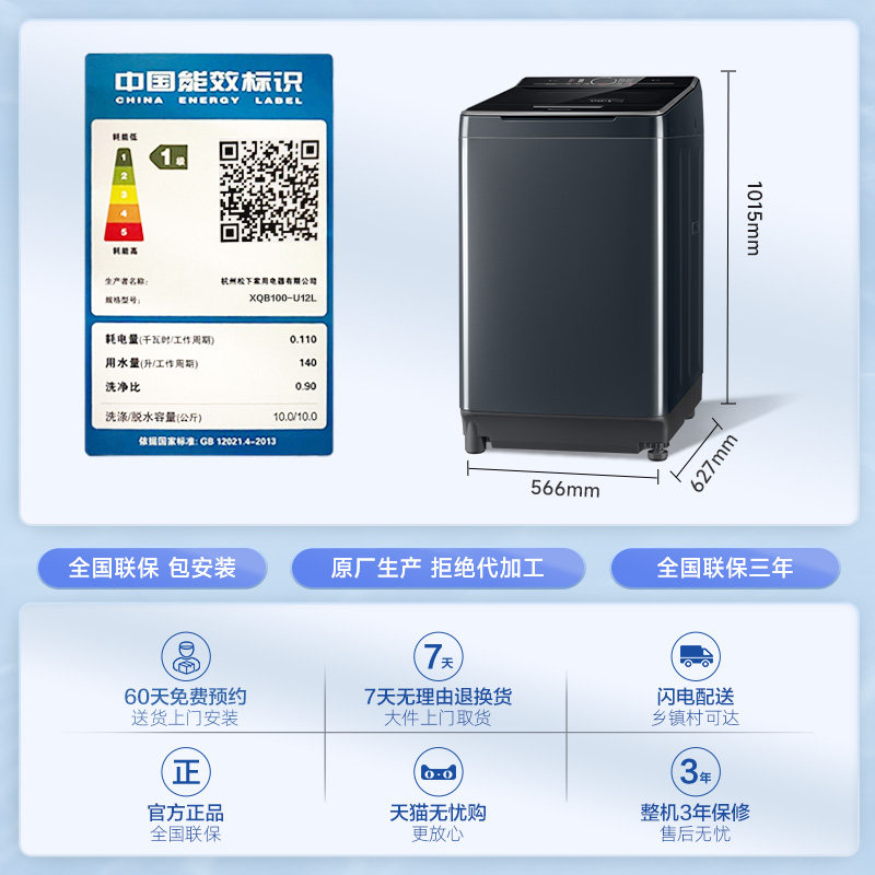 [不弯腰]松下10KG波轮洗衣机全自动家用大容量智洗U12L官方旗舰