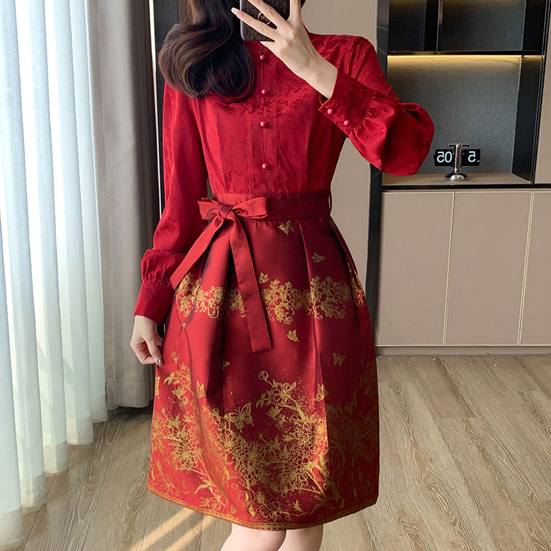 红色连衣裙2025年秋季新款女装高级感气质国风新中式刺绣马面裙子