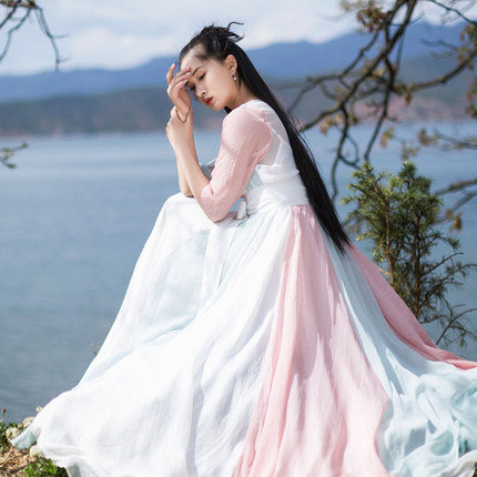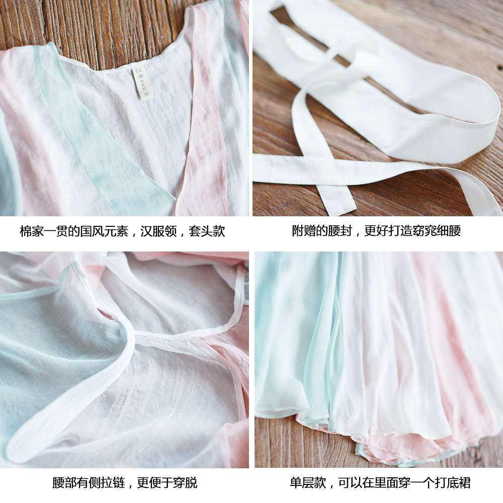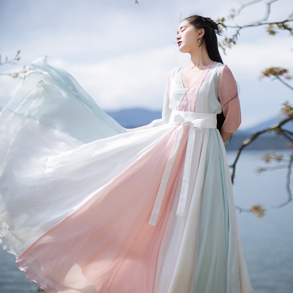 5折【限量】夏装新款复古文艺改良汉服长裙宽松拼色雪纺连衣裙女