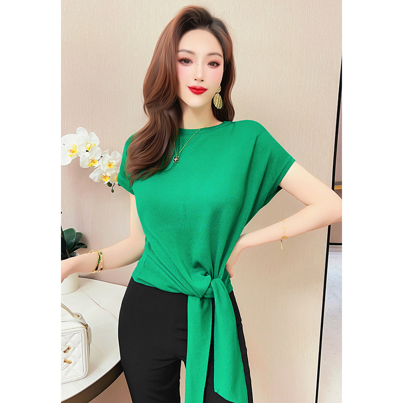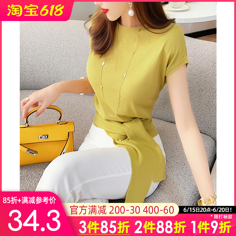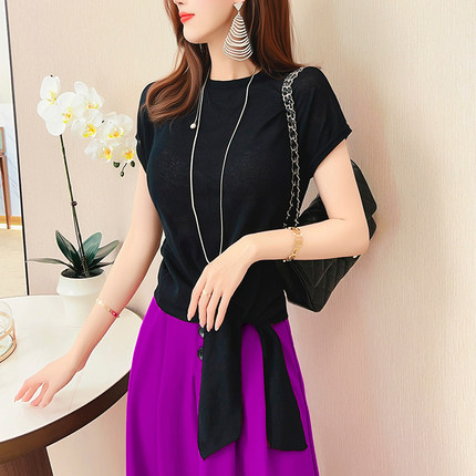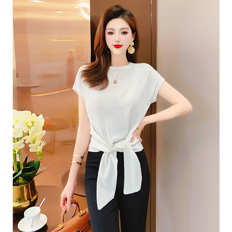飞姐定制设计感绑带T恤衫2023年夏季新款女气质修身显瘦针织上衣