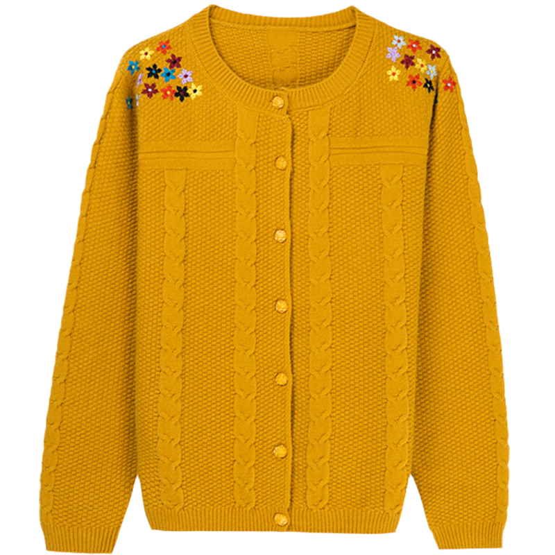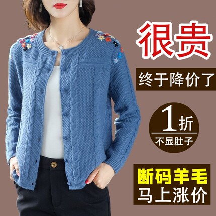 鄂尔多斯市100%纯羊绒开衫羊毛针织外套女绣花早春妈妈装毛衣上衣