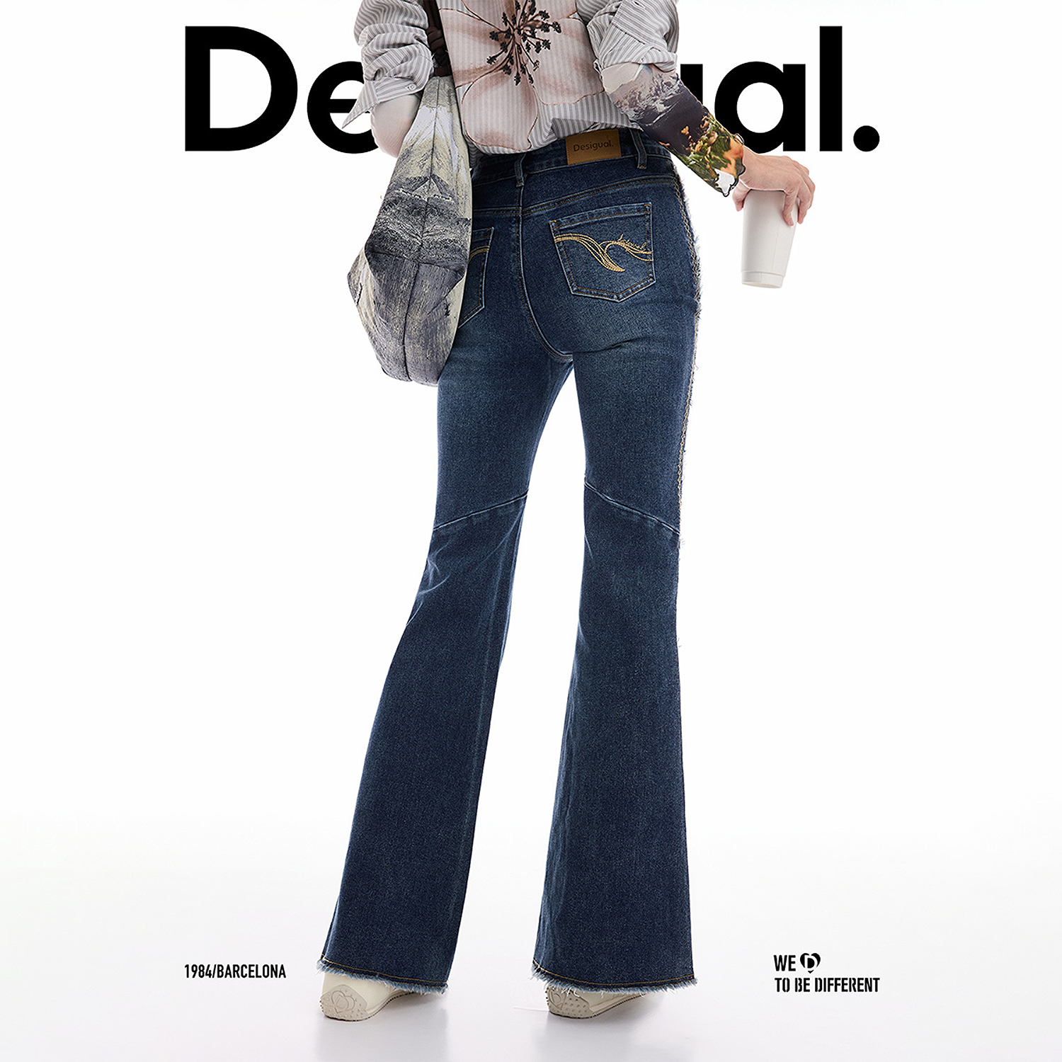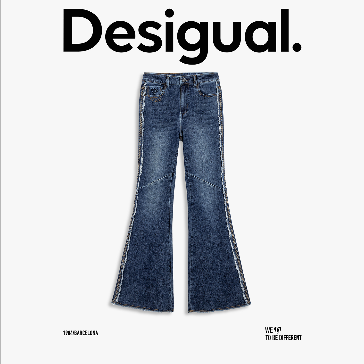 Desigual25秋冬新品刺绣毛边装饰喇叭裤女士牛仔裤