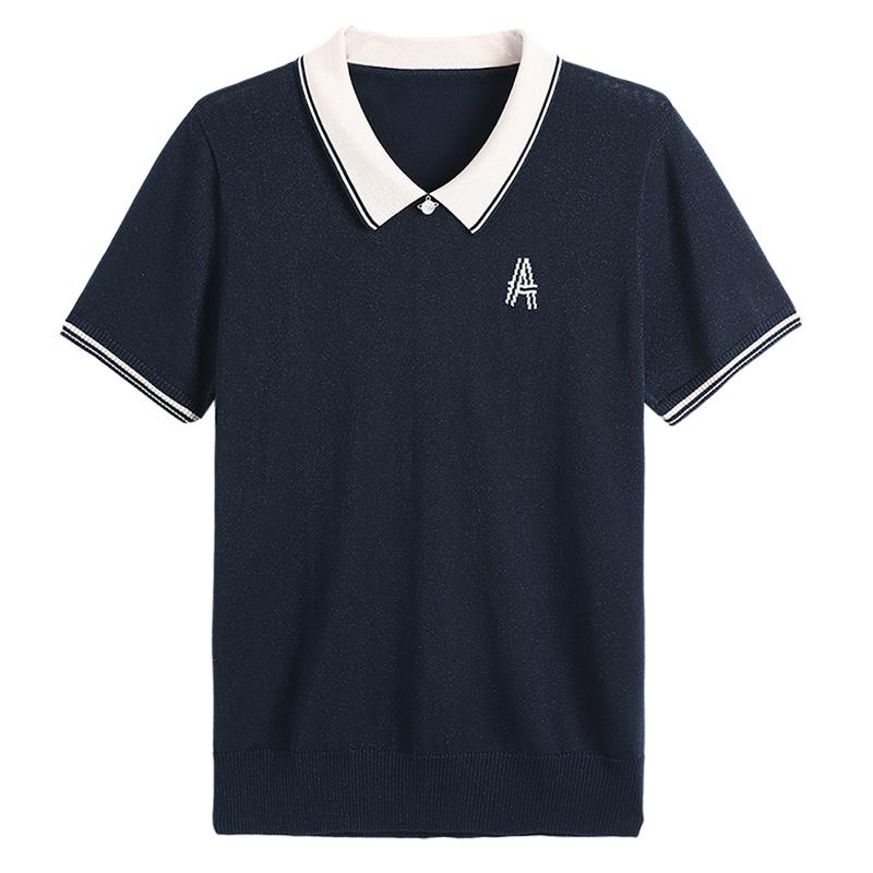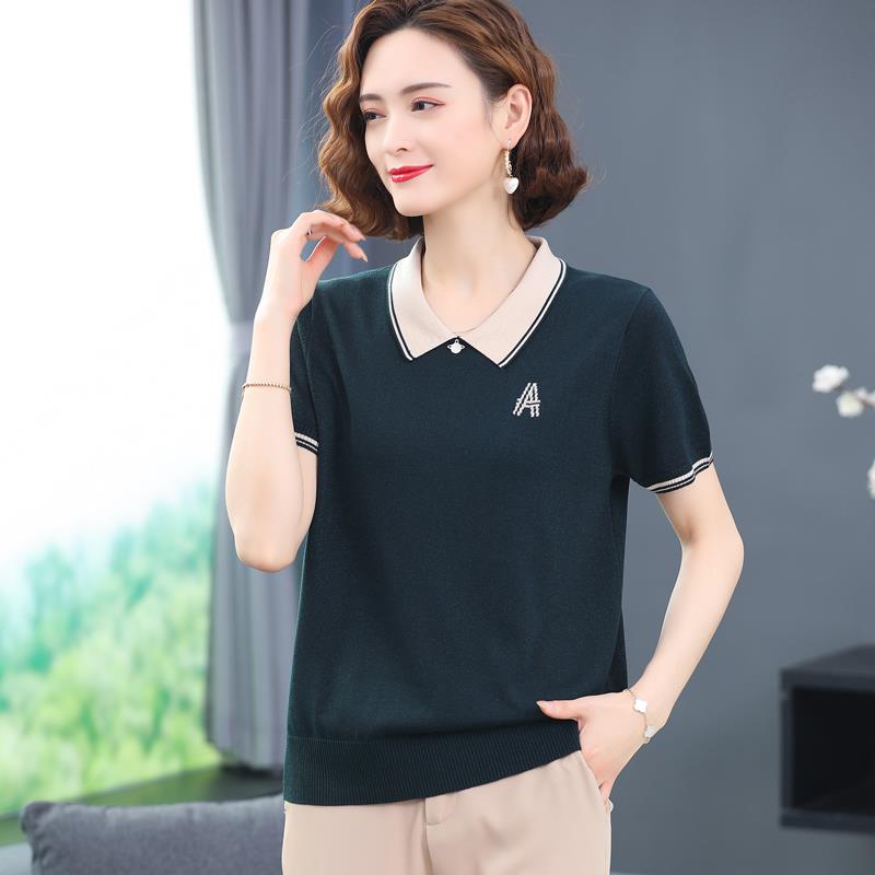 娃娃领短袖t恤女2025新款夏装冰丝针织衫中年妈妈翻领桑蚕丝上衣