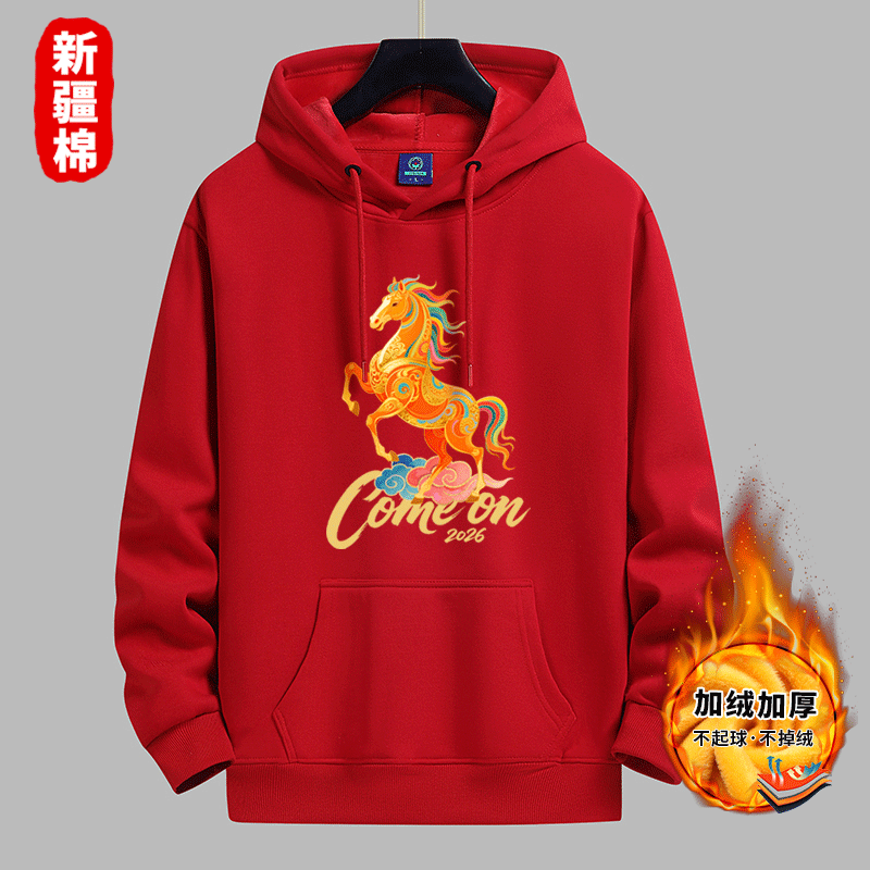 生肖马年红色卫衣男女本命年套头帽衫加绒加厚宽松连帽新年红外套