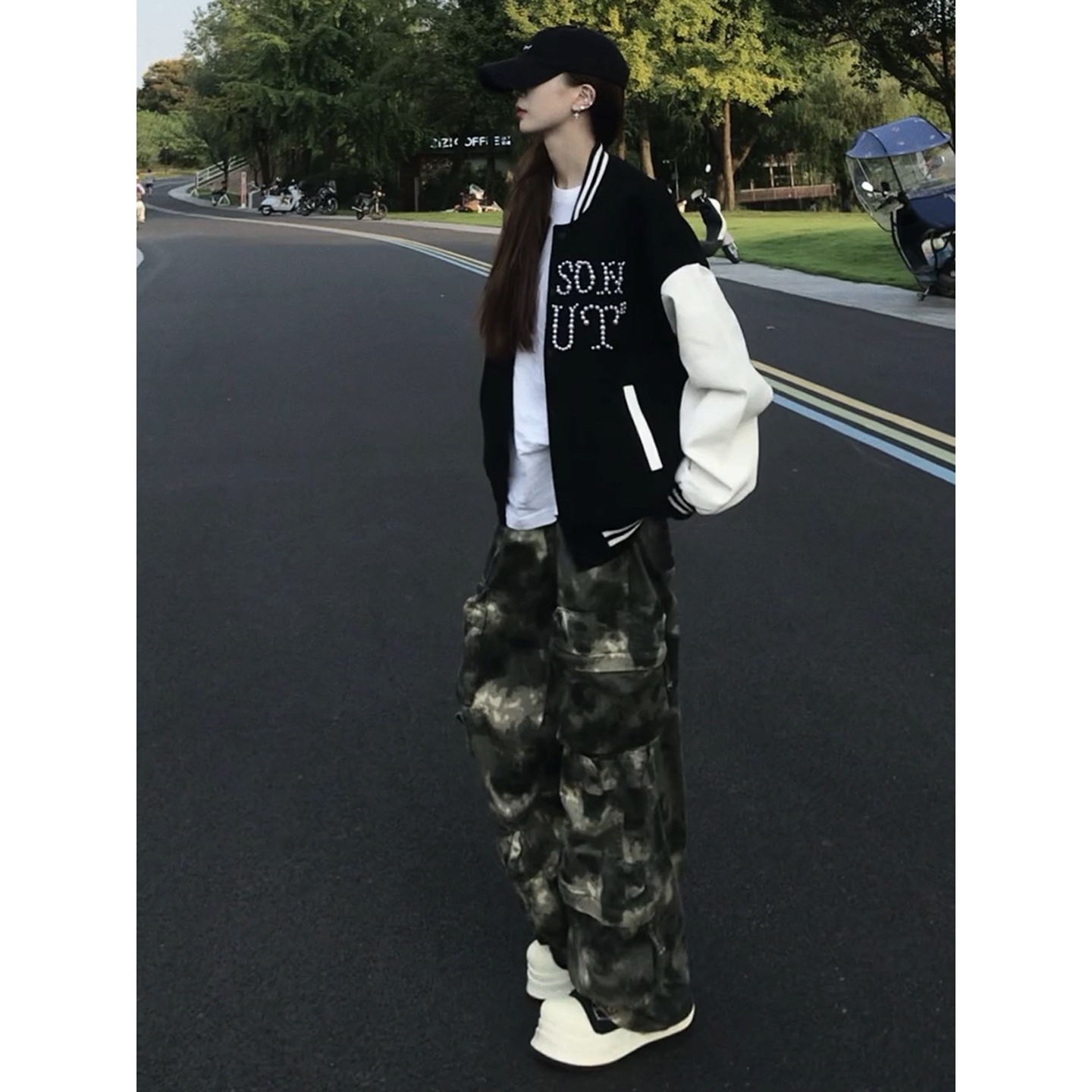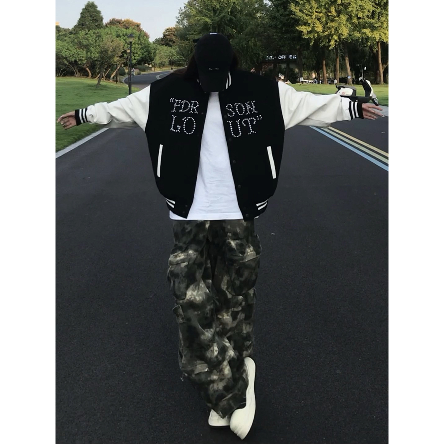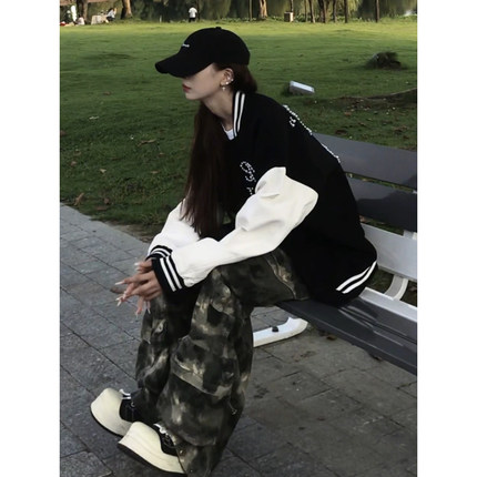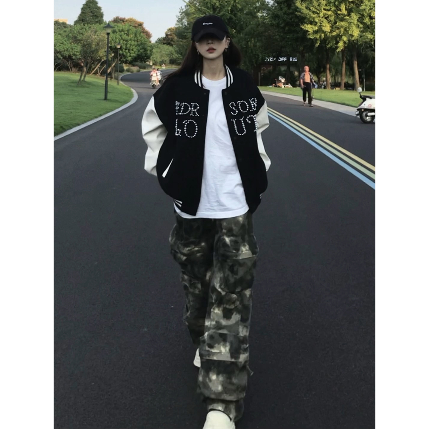 黑色珍珠棒球服男女同款秋季美式复古撞色夹克vibe情侣款刺绣外套