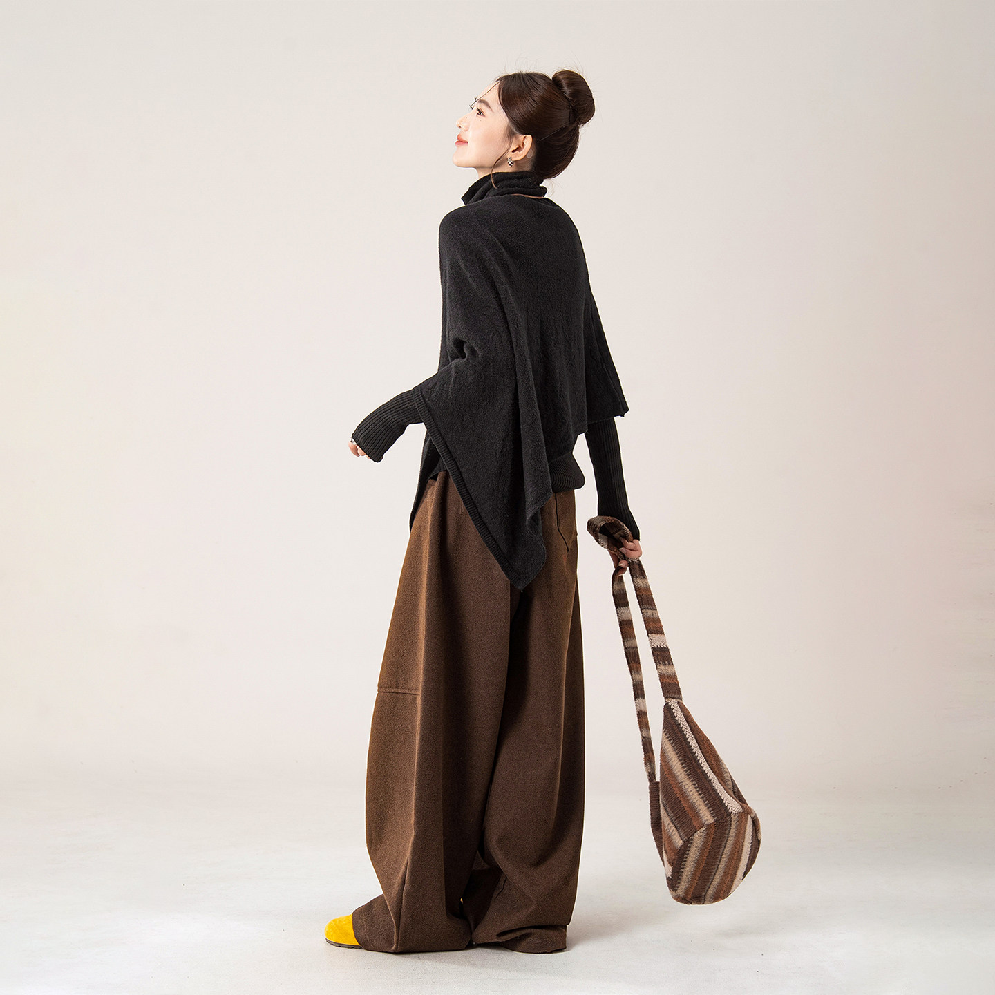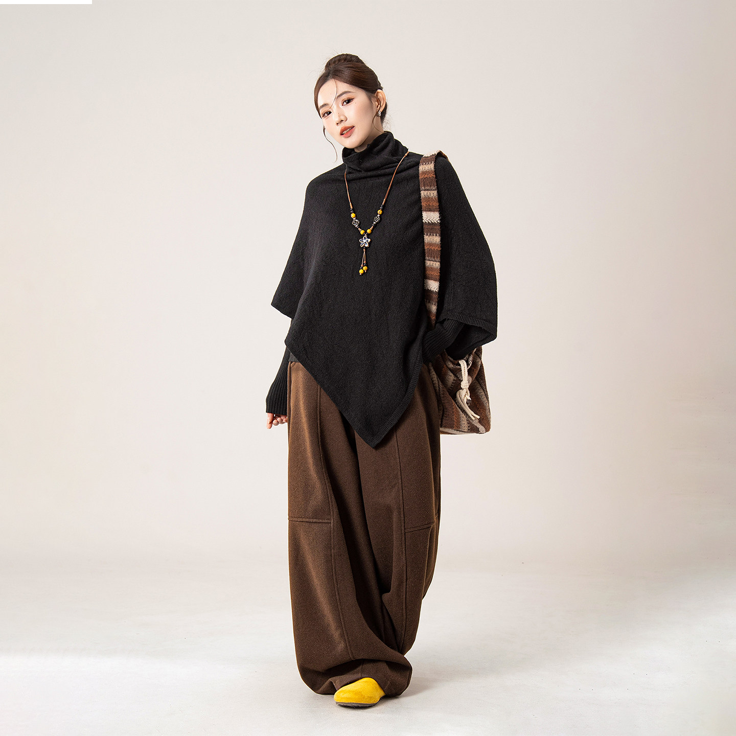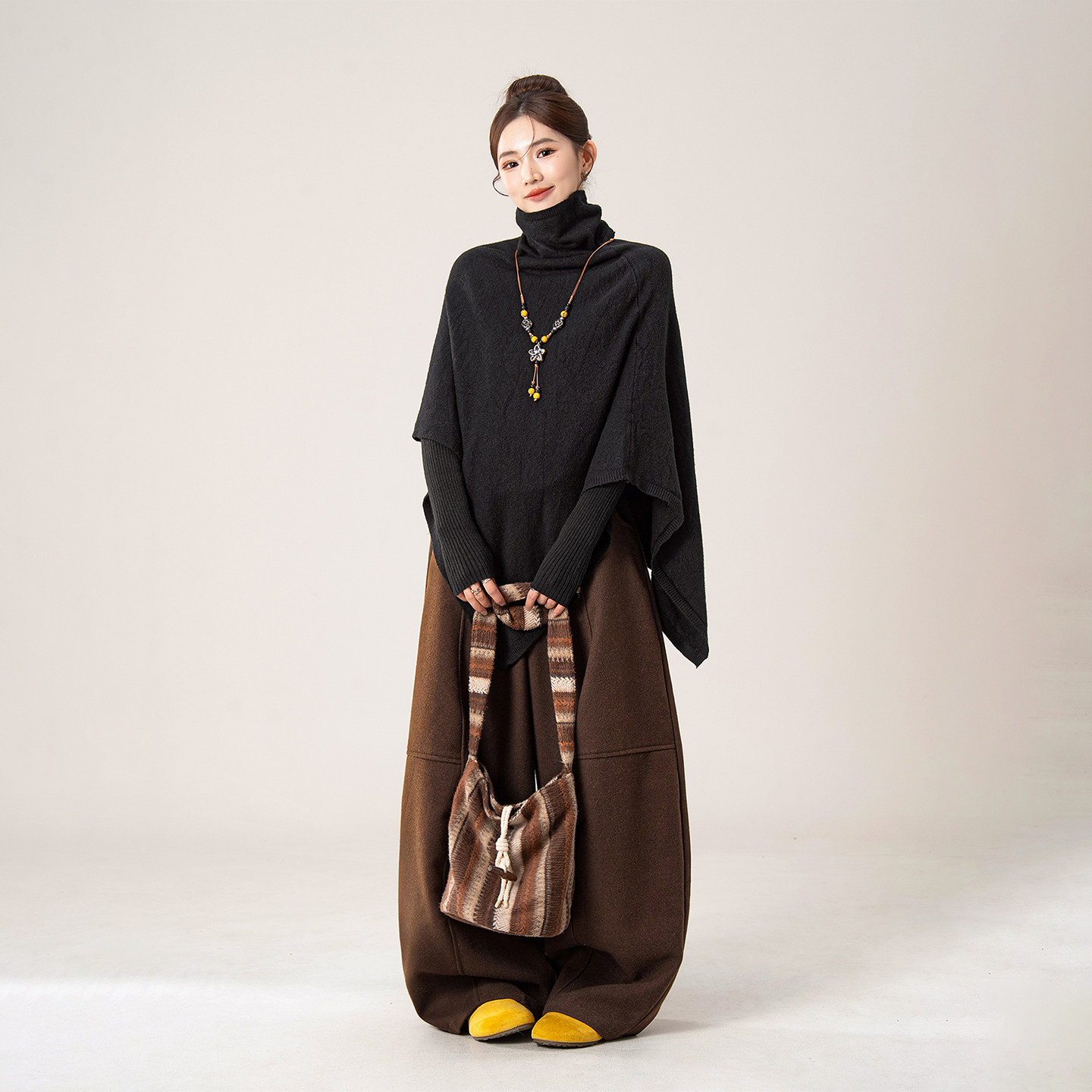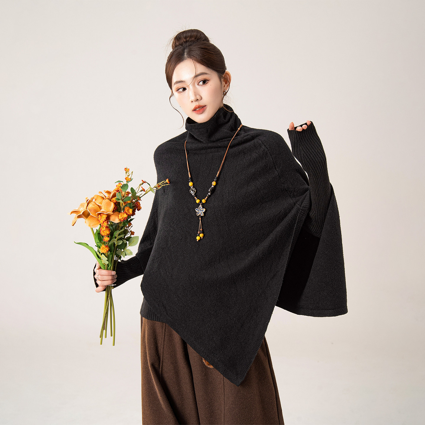 黑色高领蝙蝠袖斗篷针织衫毛衣女
