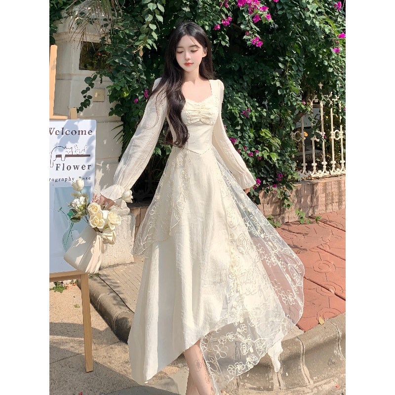 新中式清冷设计感蕾丝拼接不规则连衣裙2024春夏泡泡袖方领裙子女