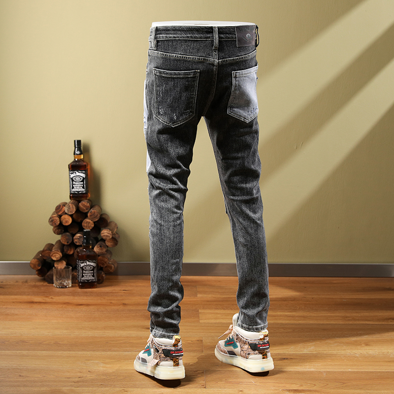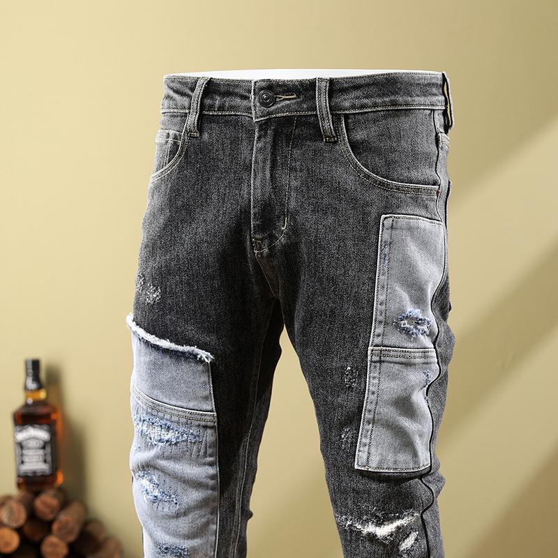 秋冬欧美个性时尚牛仔裤男潮牌休闲修身小脚弹力长裤拼接破洞补丁