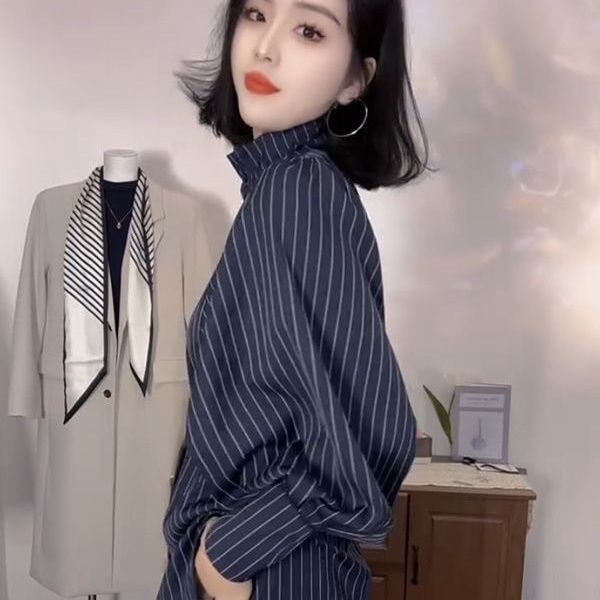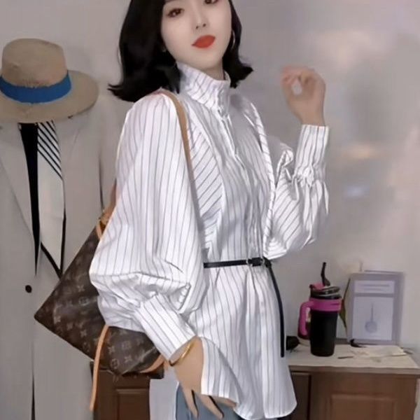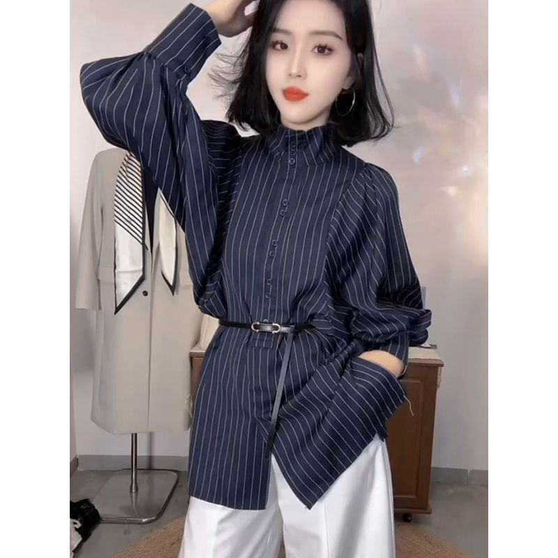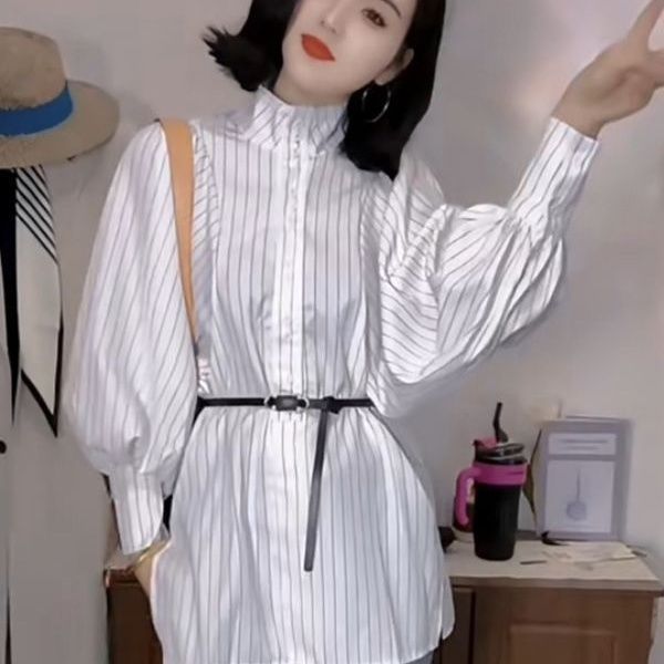 2025春季新款复古条纹宽松显瘦小众别致立领气质灯笼袖中长款衬衫