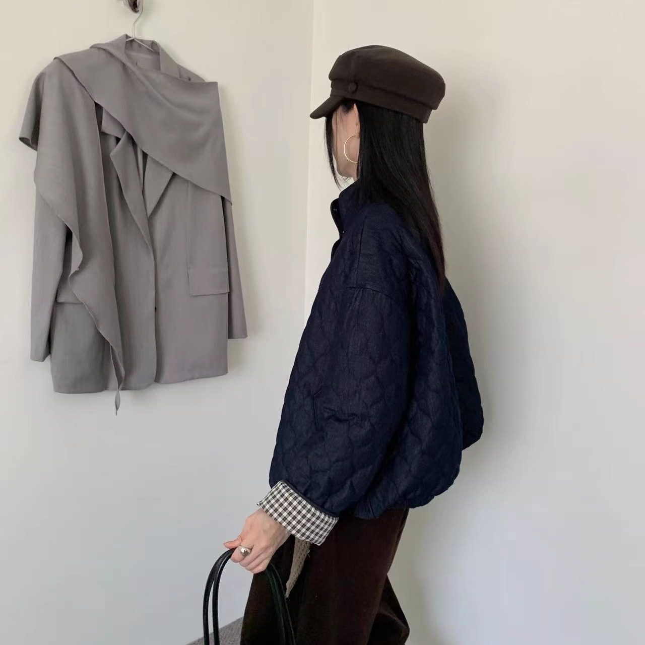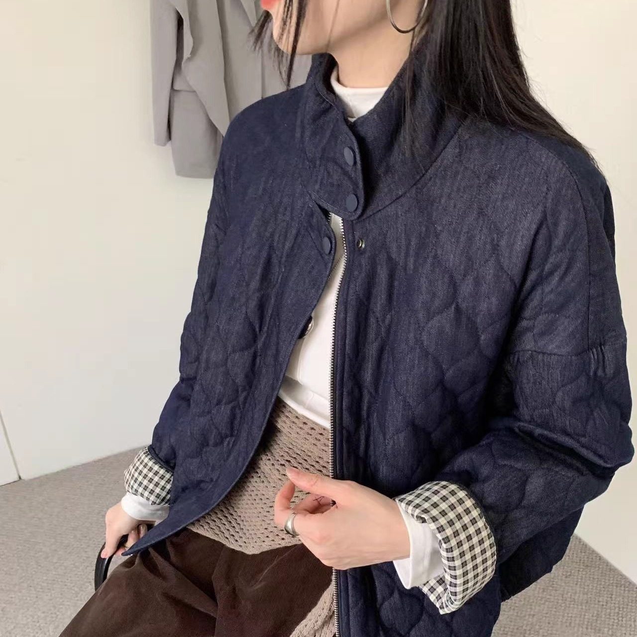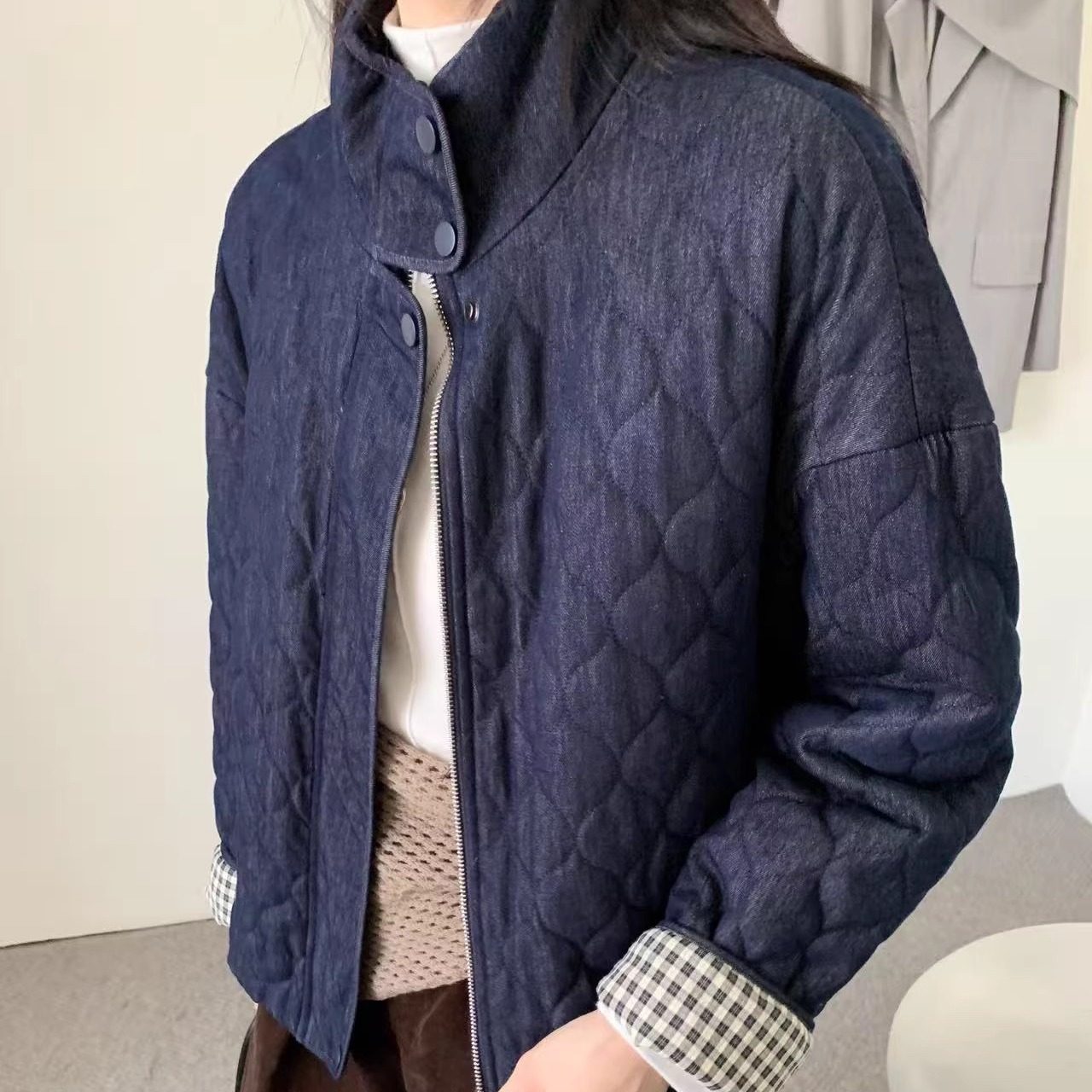 曼城记忆 本期重磅 撞色翻边牛仔菱格纹拉链外套 复古牛仔小棉服