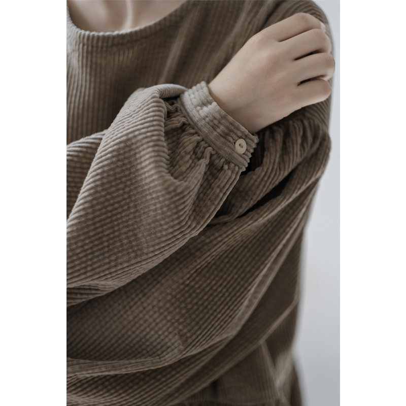 复述秋冬质感灯芯绒文艺甜美泡泡袖连衣裙新品卡其宽松长袖裙