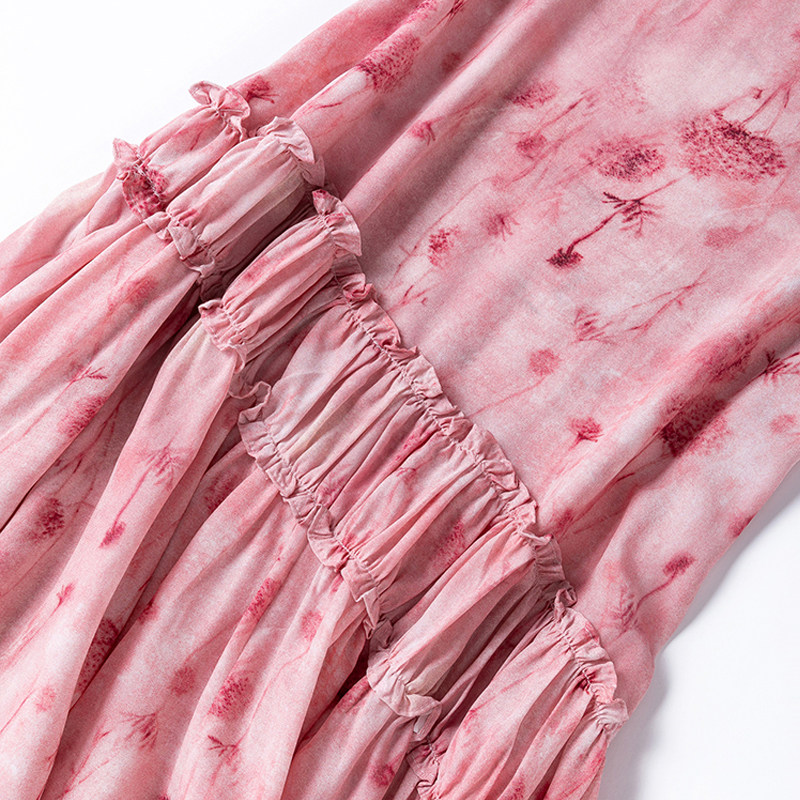 3.2米大摆“浪漫粉色水墨”真丝飞飞袖斜腰线长裙度假风连衣裙