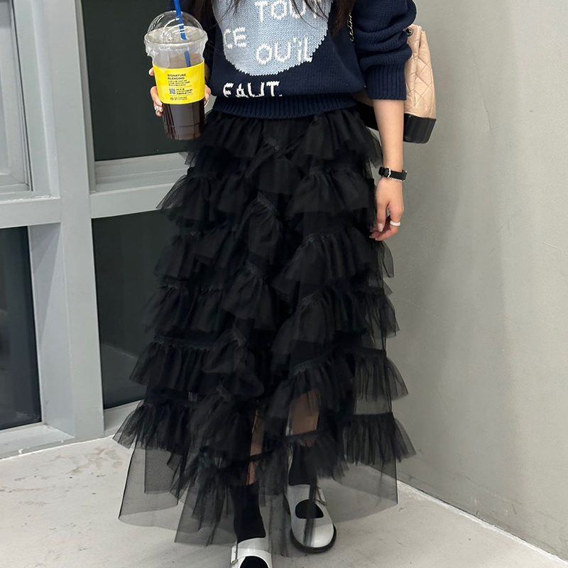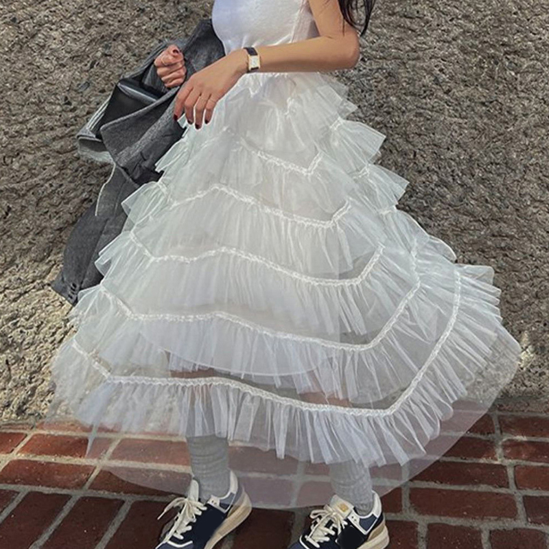 韩国chic春季法式浪漫高腰百搭拼接荷叶边层次感设计长款半身裙女