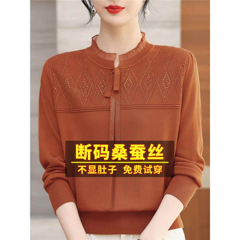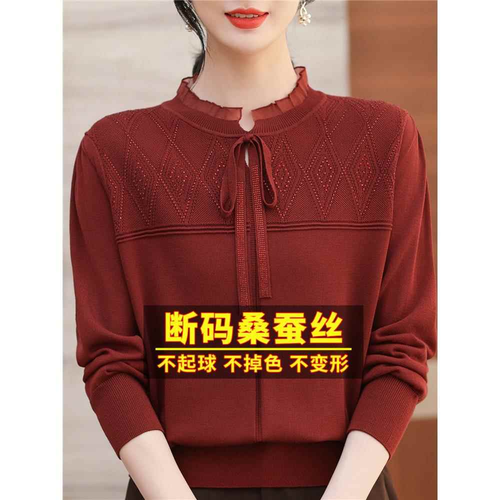春装新款桑蚕丝长袖t恤女妈妈漂亮系带针织上衣蕾丝内搭打底小衫