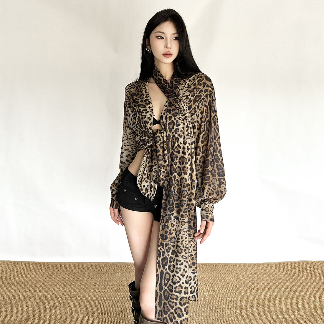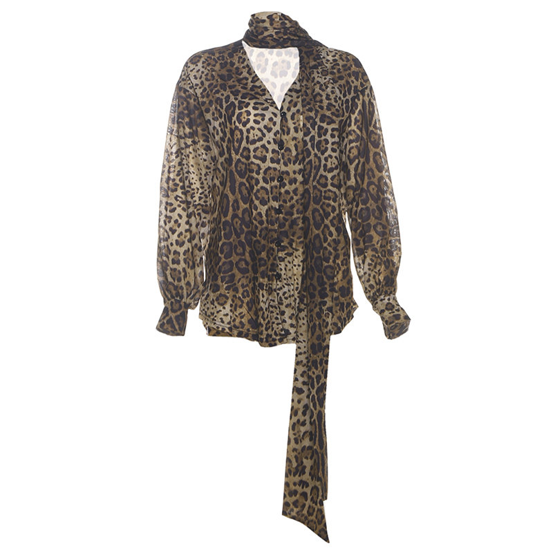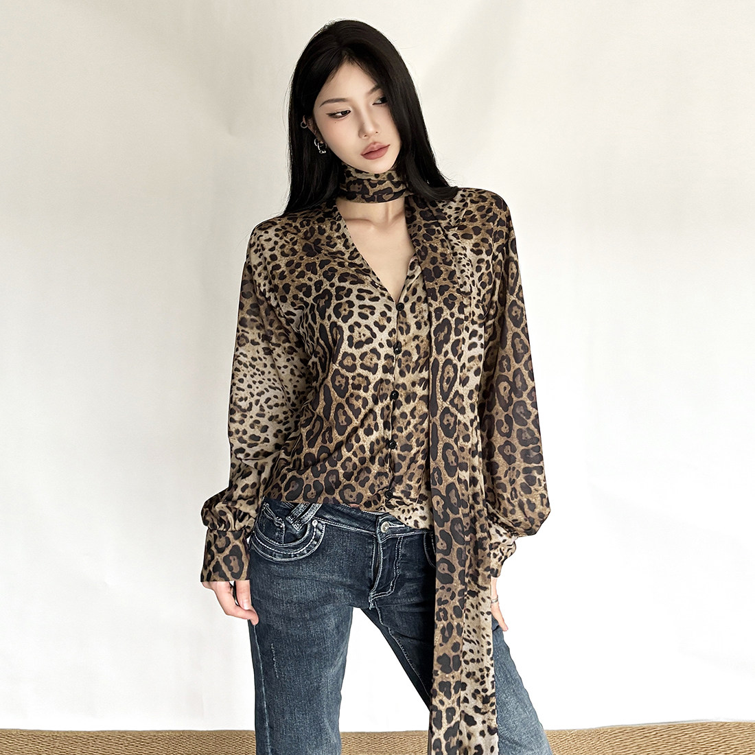 老钱风复古豹纹围脖飘带V领衬衫