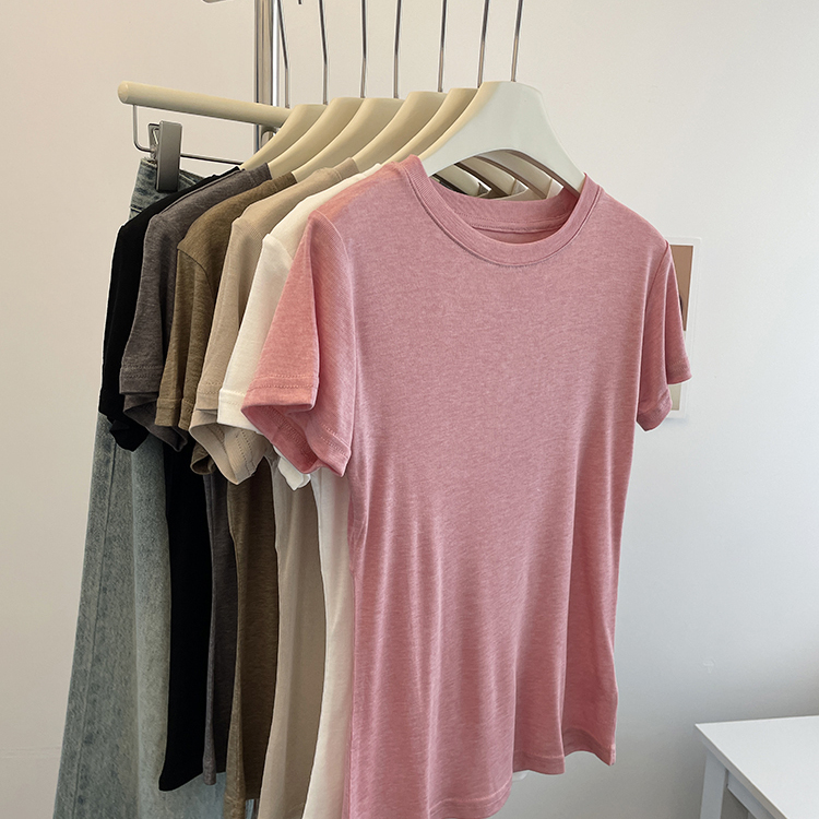 柠波家。莱赛尔天丝圆领短袖T恤女夏透气薄款修身显瘦纯色打底衫