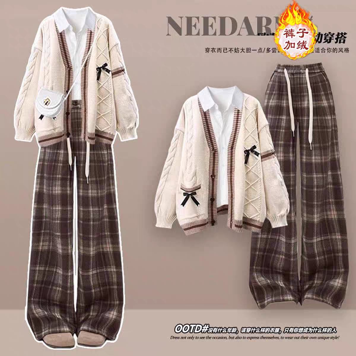 秋冬装搭配一整套女大童初中高中学生甜美毛衣衬衫加绒格子裤套装