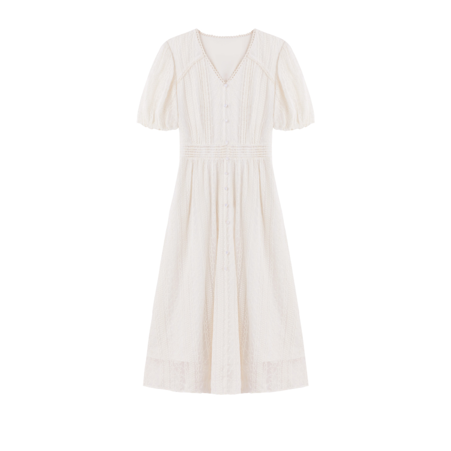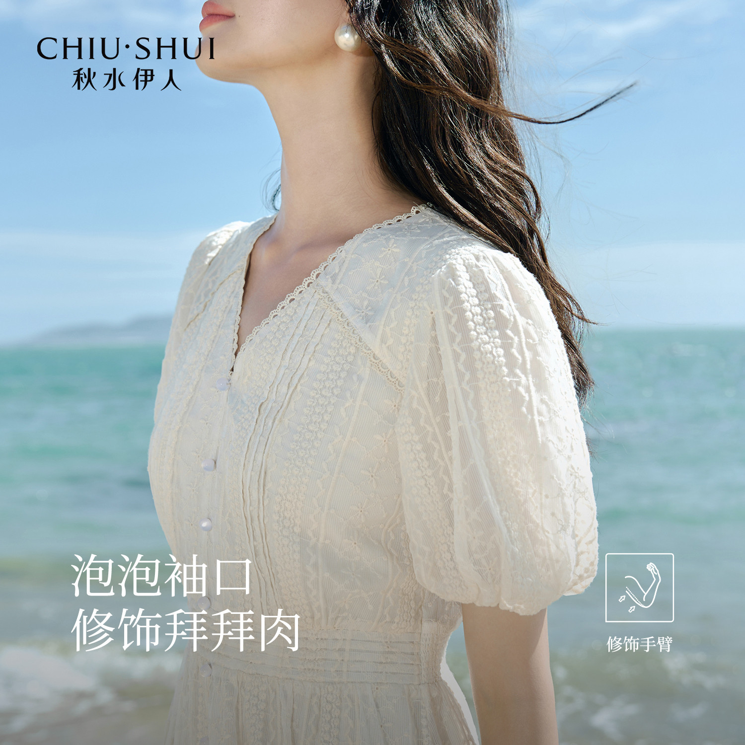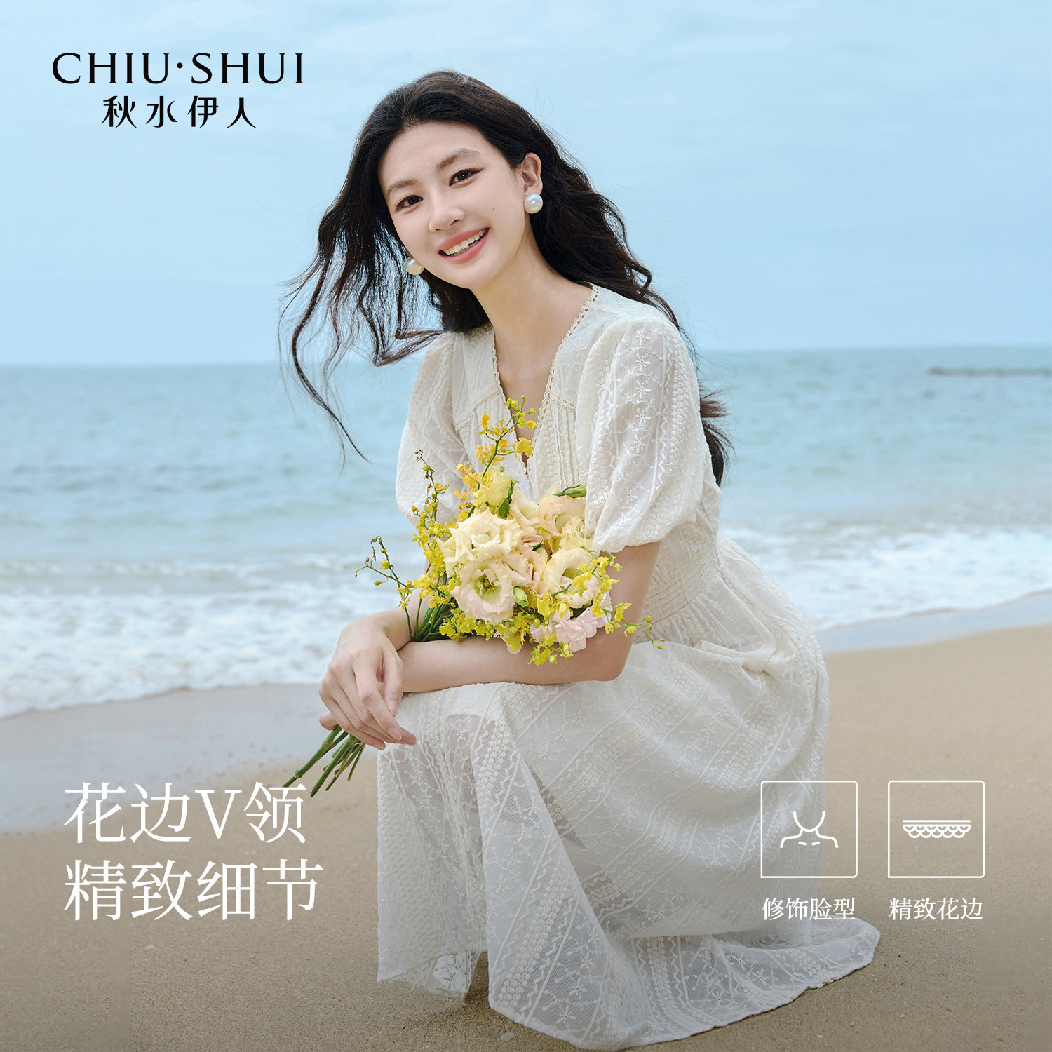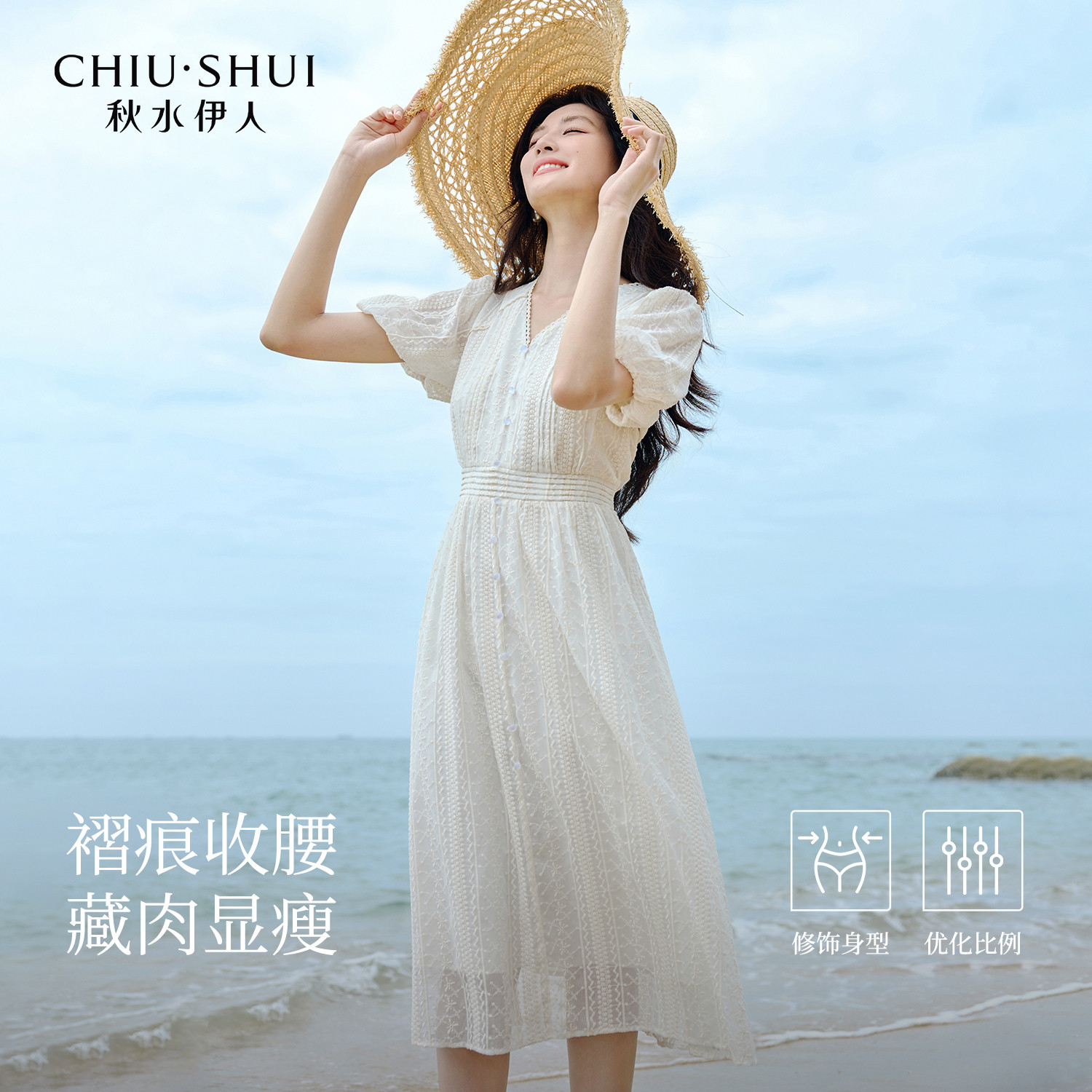 秋水伊人X型高腰V领蕾丝绣花连衣裙2025夏季新款女休闲简约中长裙