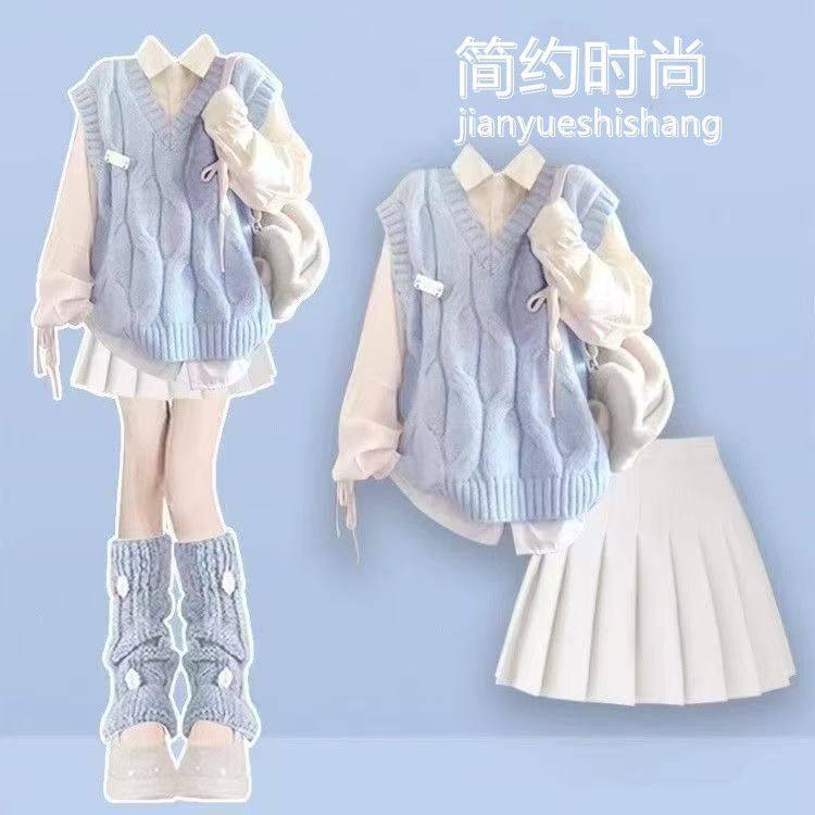 女童秋冬套装2025新款多巴胺洋气外套时髦马甲针织初中学生百褶裙