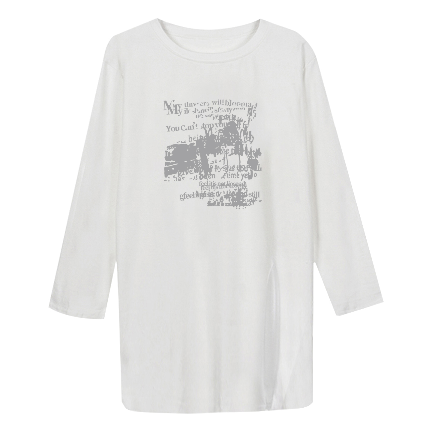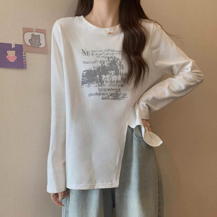 美式开叉中长款长袖t恤女白色宽松上衣2025年秋季新款显瘦打底衫