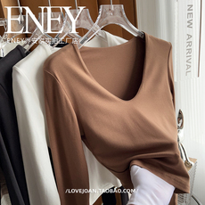 鹅蛋领~敲显瘦!欧货弹力椭圆V领长袖t恤女打底衫美式上衣内搭女