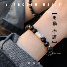 【黑猫~守护】足银法棍猫 冷淡风天然黑曜石猫眼石银珠情侣手链