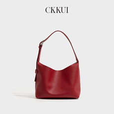 CKKUI 荔枝纹理软皮红色包包2026新款手提水桶包高级感单肩托特包