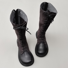 真皮纯皮大头宽版女靴长高筒外贸圆头层牛皮系带肥胖脚原单骑士靴