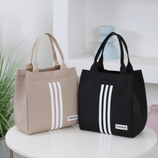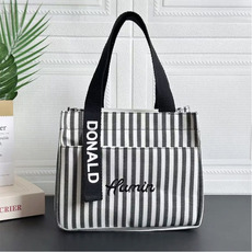 条纹拉链外口袋帆布手提包时尚女包便当包大容量妈咪包上班零食包