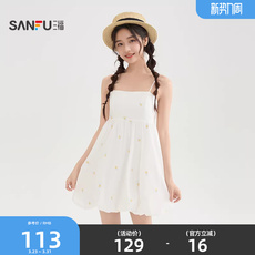 三福连衣裙2026新款春季时尚花苞短裙碎花高腰吊带裙子女装519097