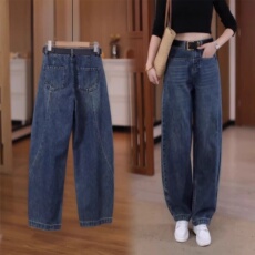 复古加绒弯刀牛仔裤女2025新款宽松小个子九分加厚显瘦直筒阔腿裤