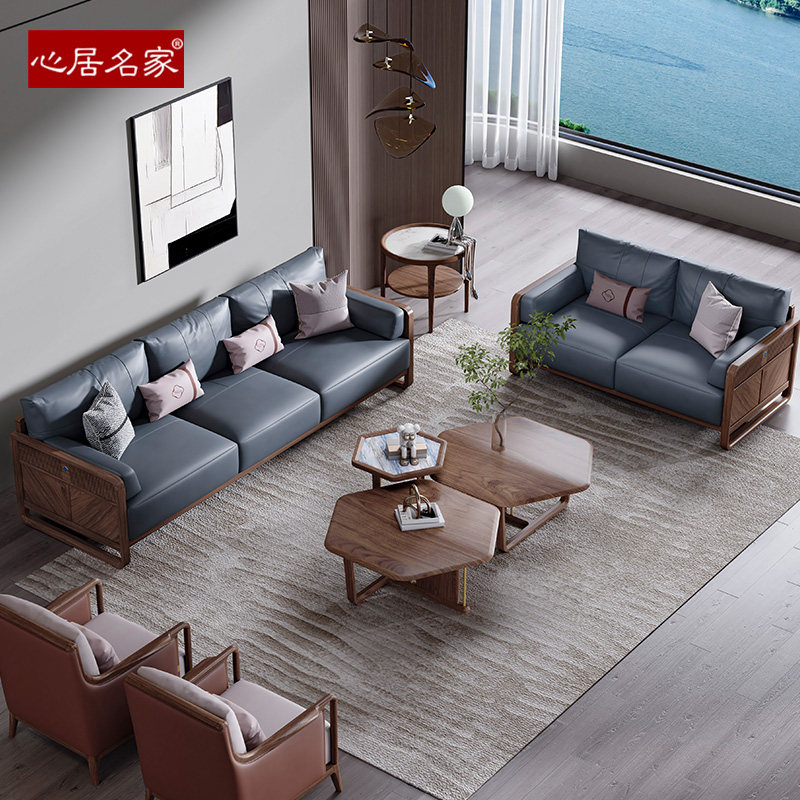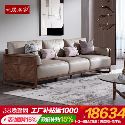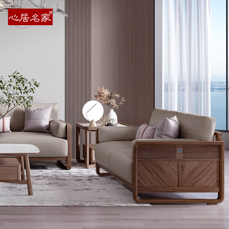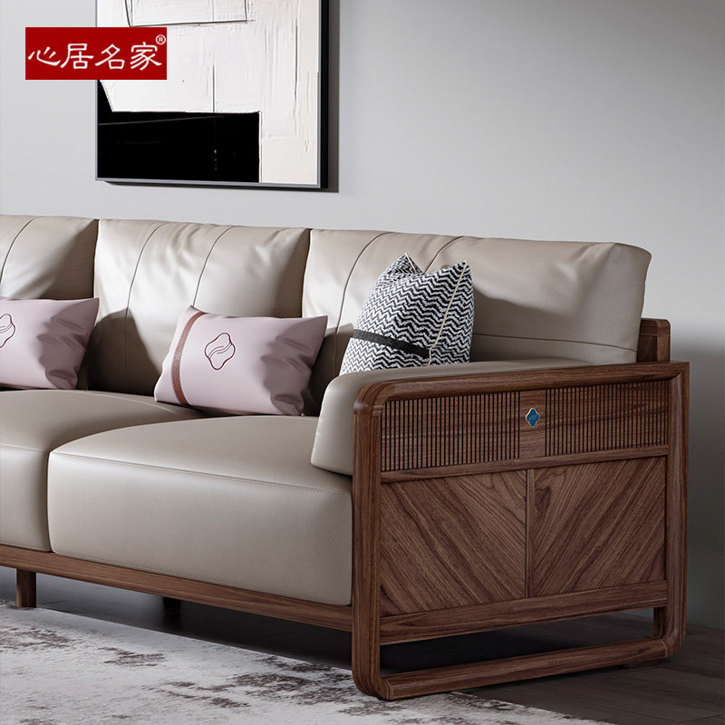 心居名家实木沙发北美黑胡桃木新中式客厅直排沙发组合头层真皮