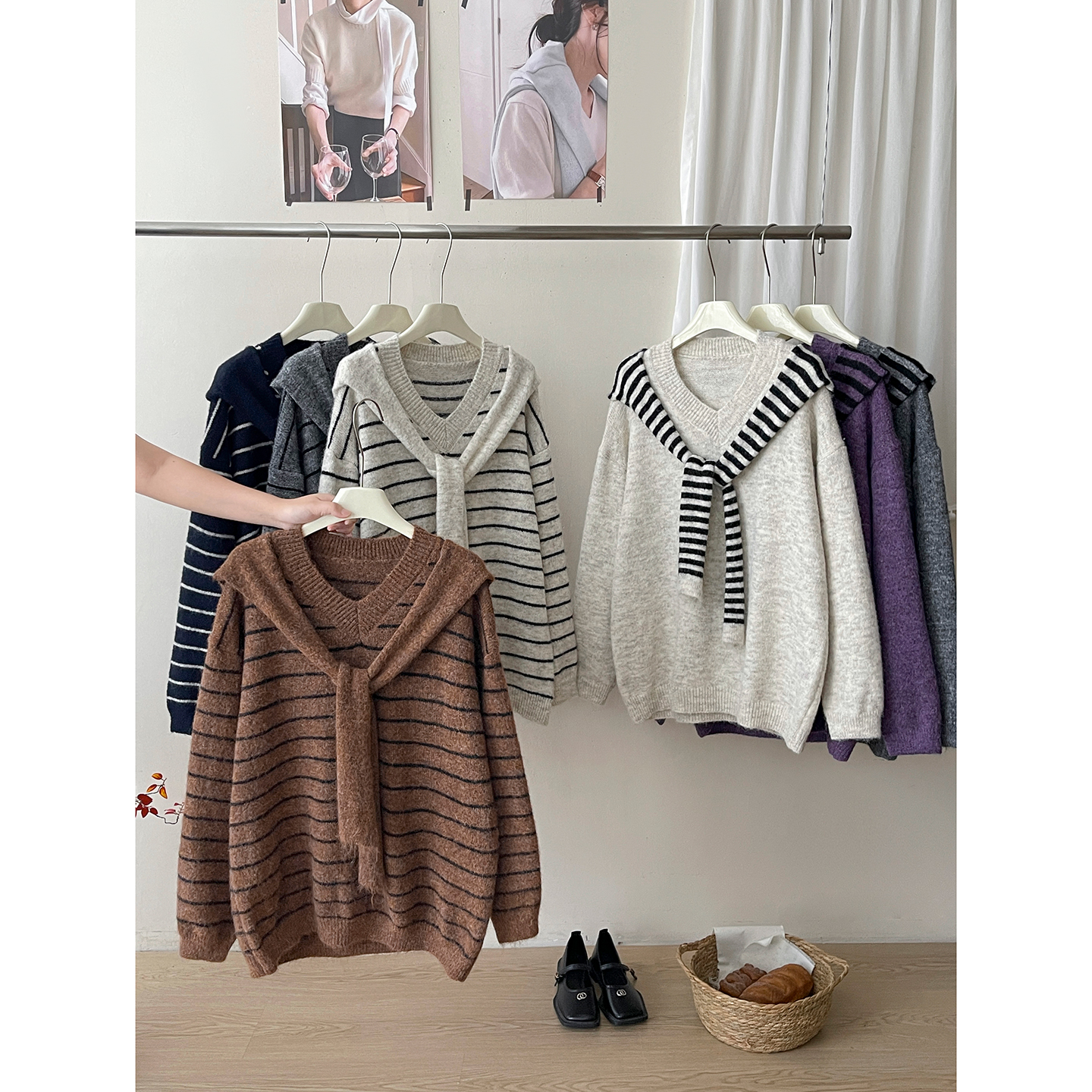 法式慵懒老钱风披肩假两件软糯条纹毛衣女秋冬复古百搭洋气针织衫
