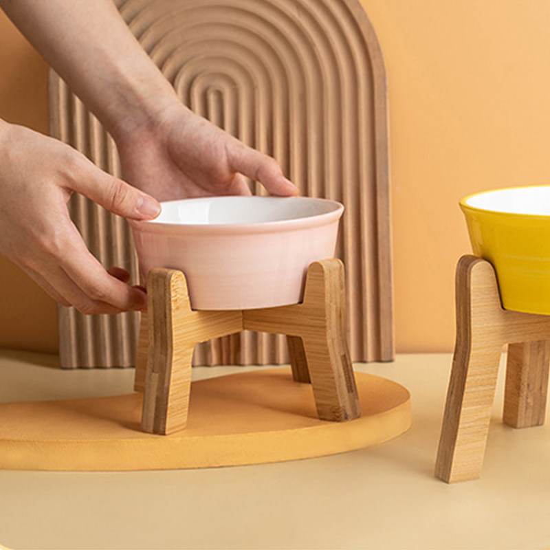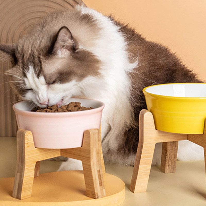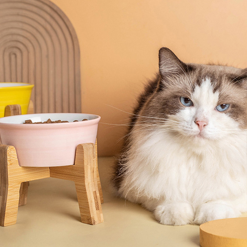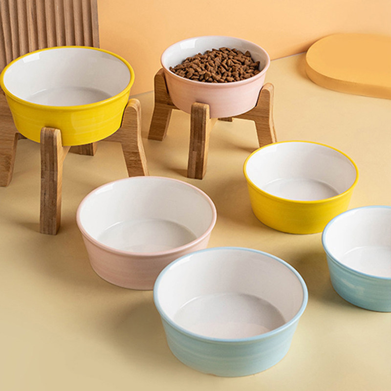 元気喵丨陶瓷猫碗护颈狗碗猫粮碗猫食盆狗盆宠物碗喝水碗碗架木架