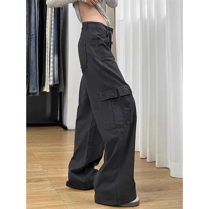 深灰色多口袋工装牛仔裤女2025新款高腰宽松设计感显瘦阔腿拖地裤