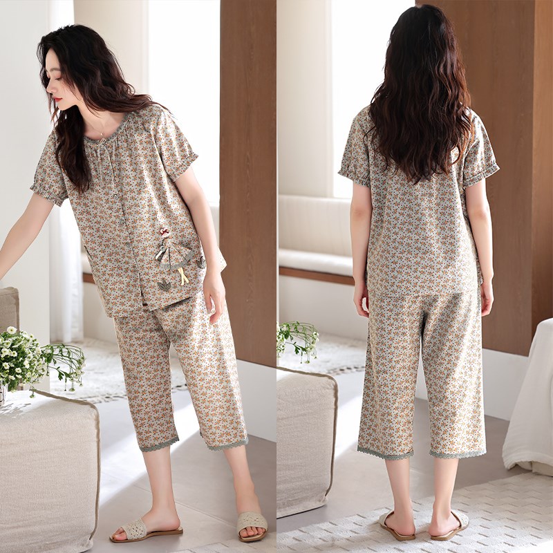 睡衣女士夏季纯棉短袖七分裤薄款夏E天中年妈妈全棉夏款大码家居