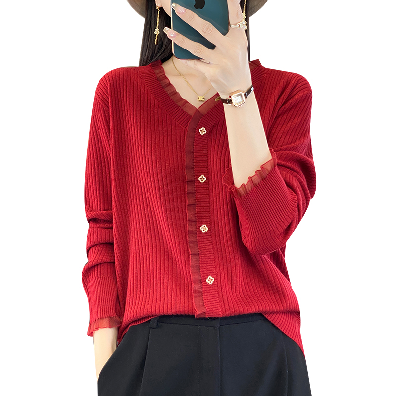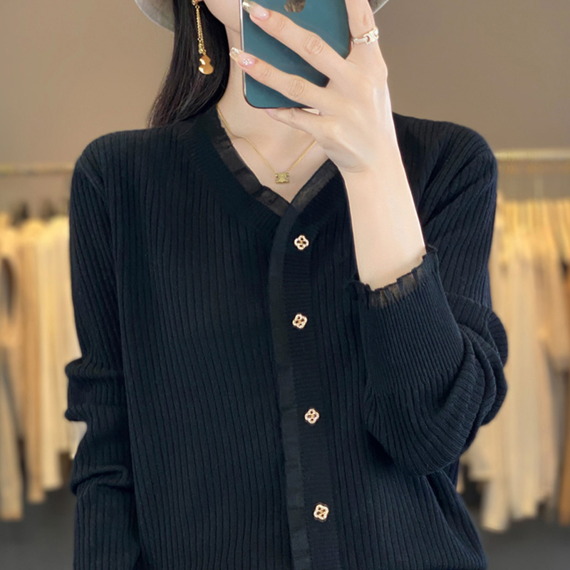 V领蕾丝打底衫女春秋2025新款今年流行漂亮小衫针织上衣大码毛衣