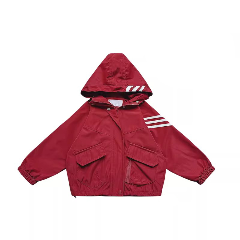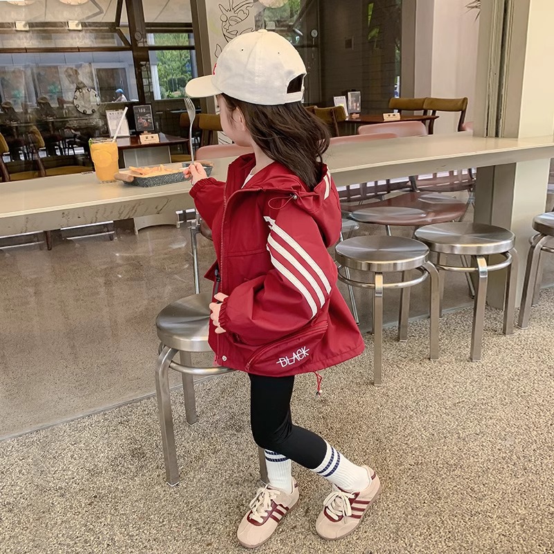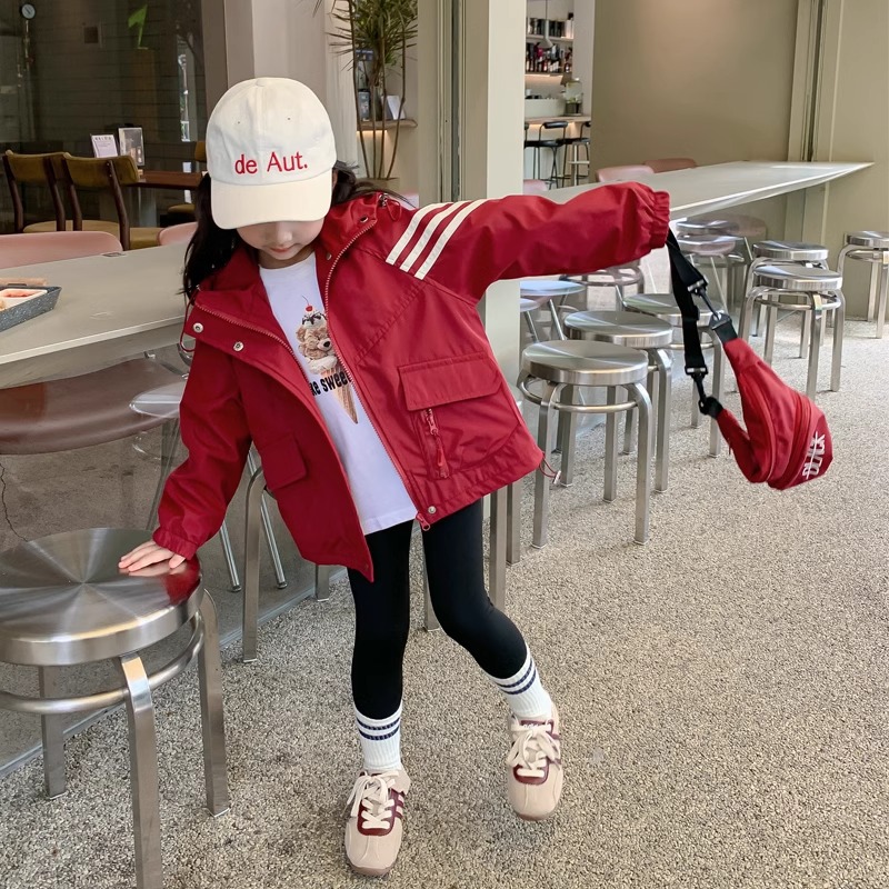 女童红色外套春秋款2025新款时尚洋气连帽冲锋衣女孩秋装开衫上衣