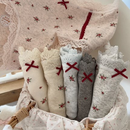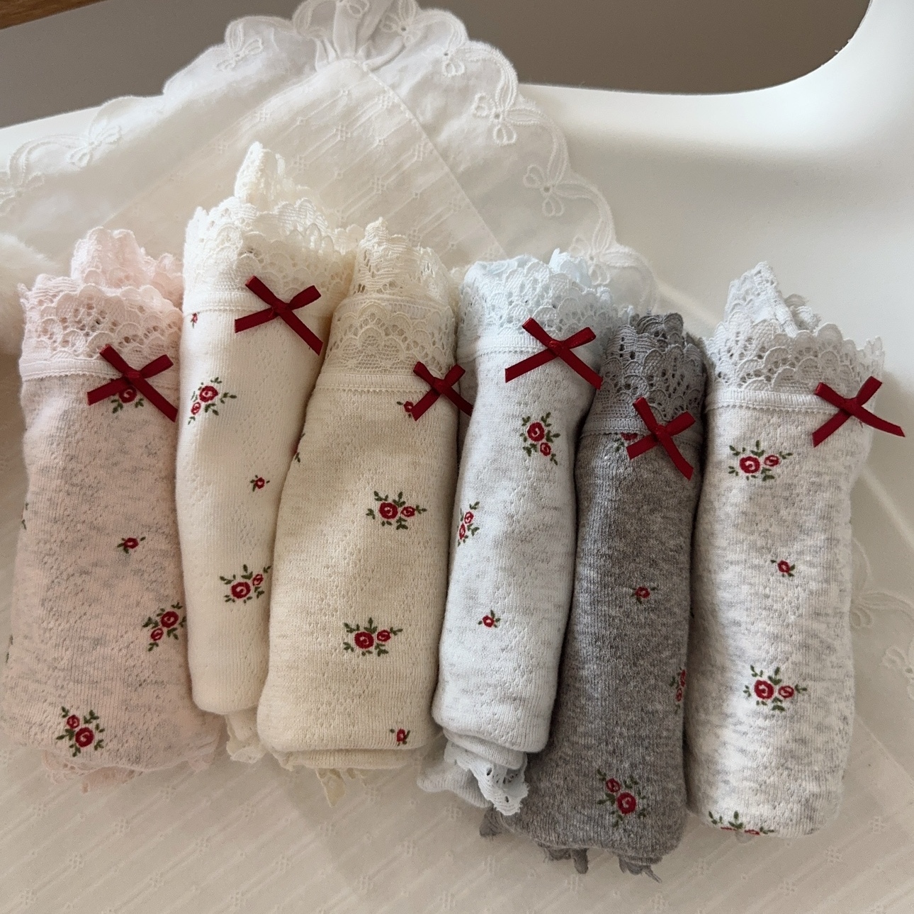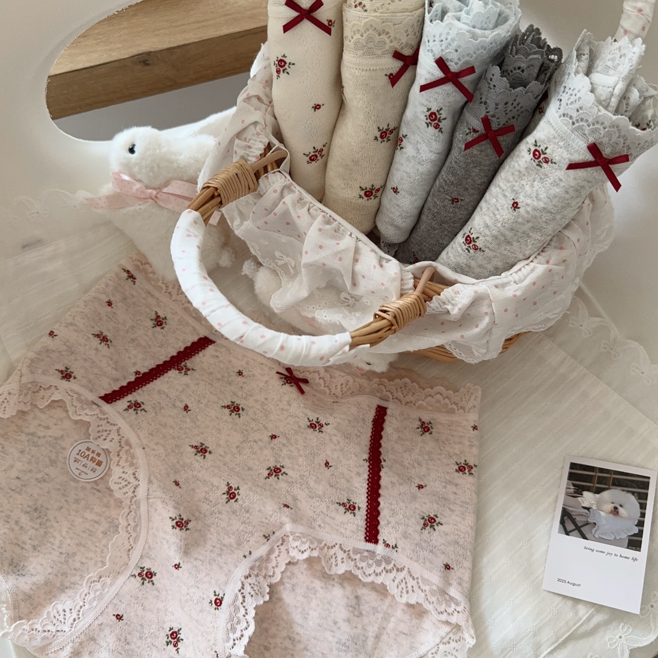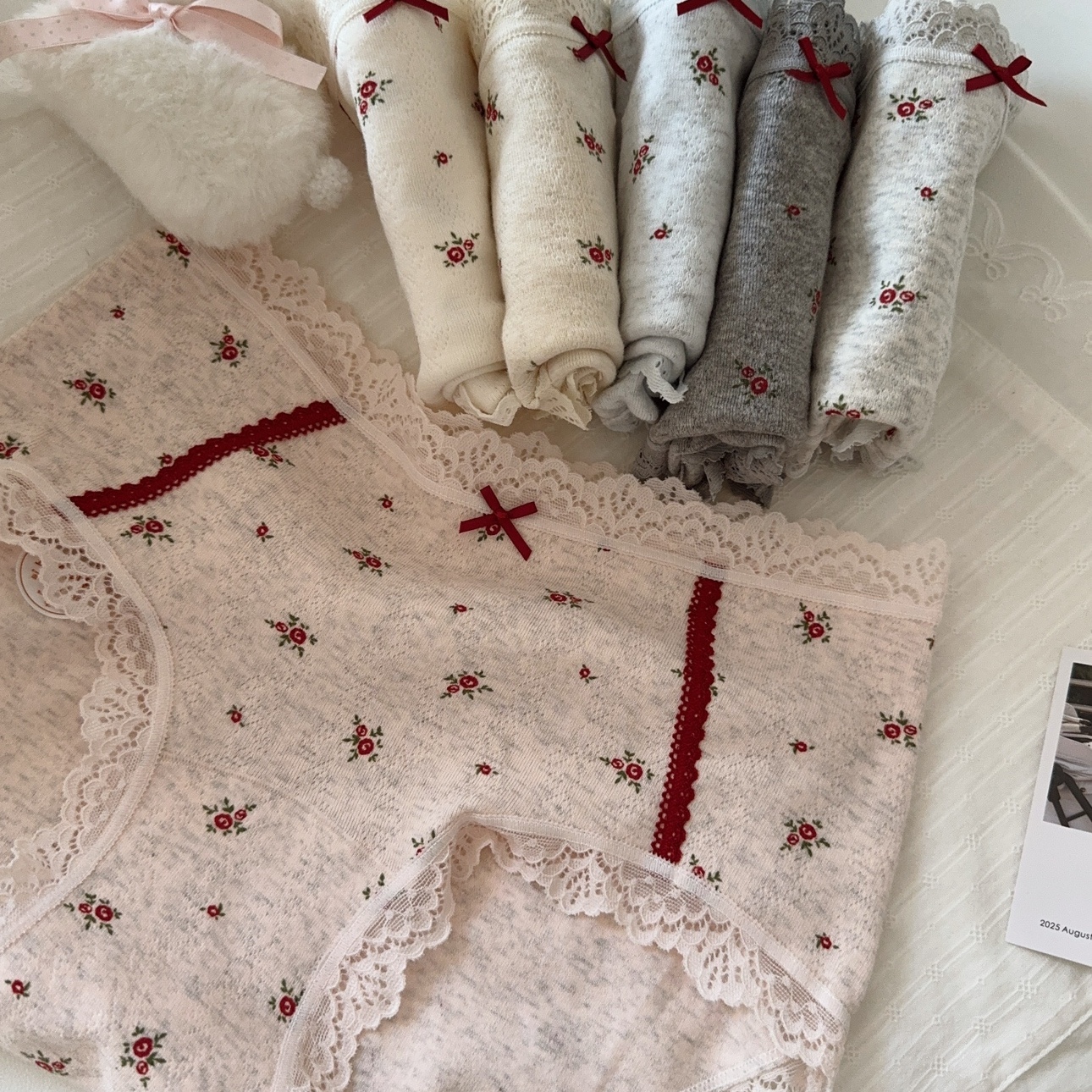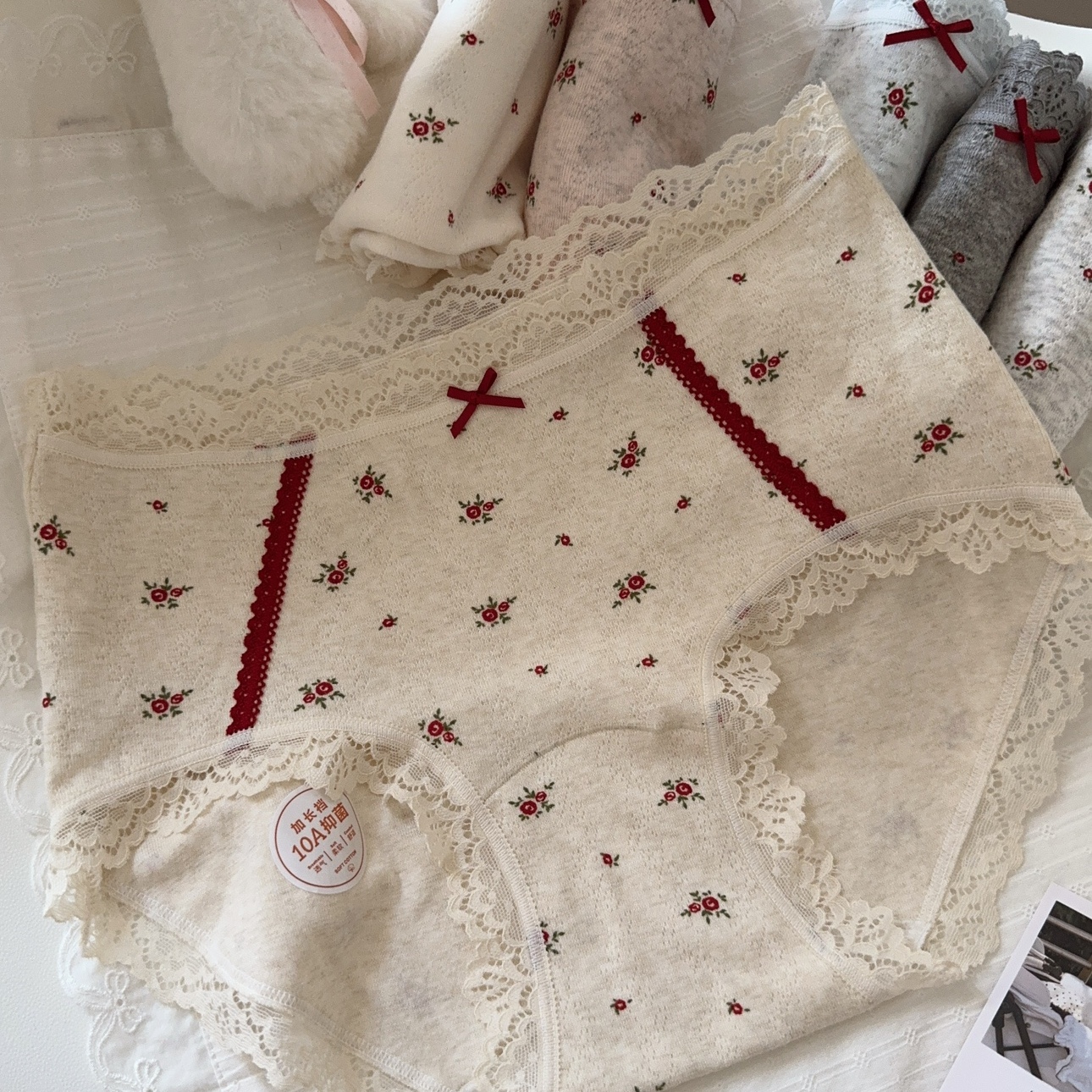 芭蕾风复古灰红色系蕾丝花边小碎花秋冬暖肤中腰三角裤棉无痕内裤