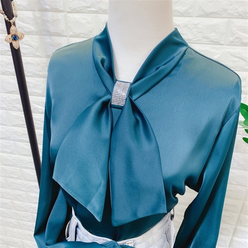 蝴蝶结亮钻长袖亮面雪纺衫女春装OL职业装小领结白色衬衫打底上衣