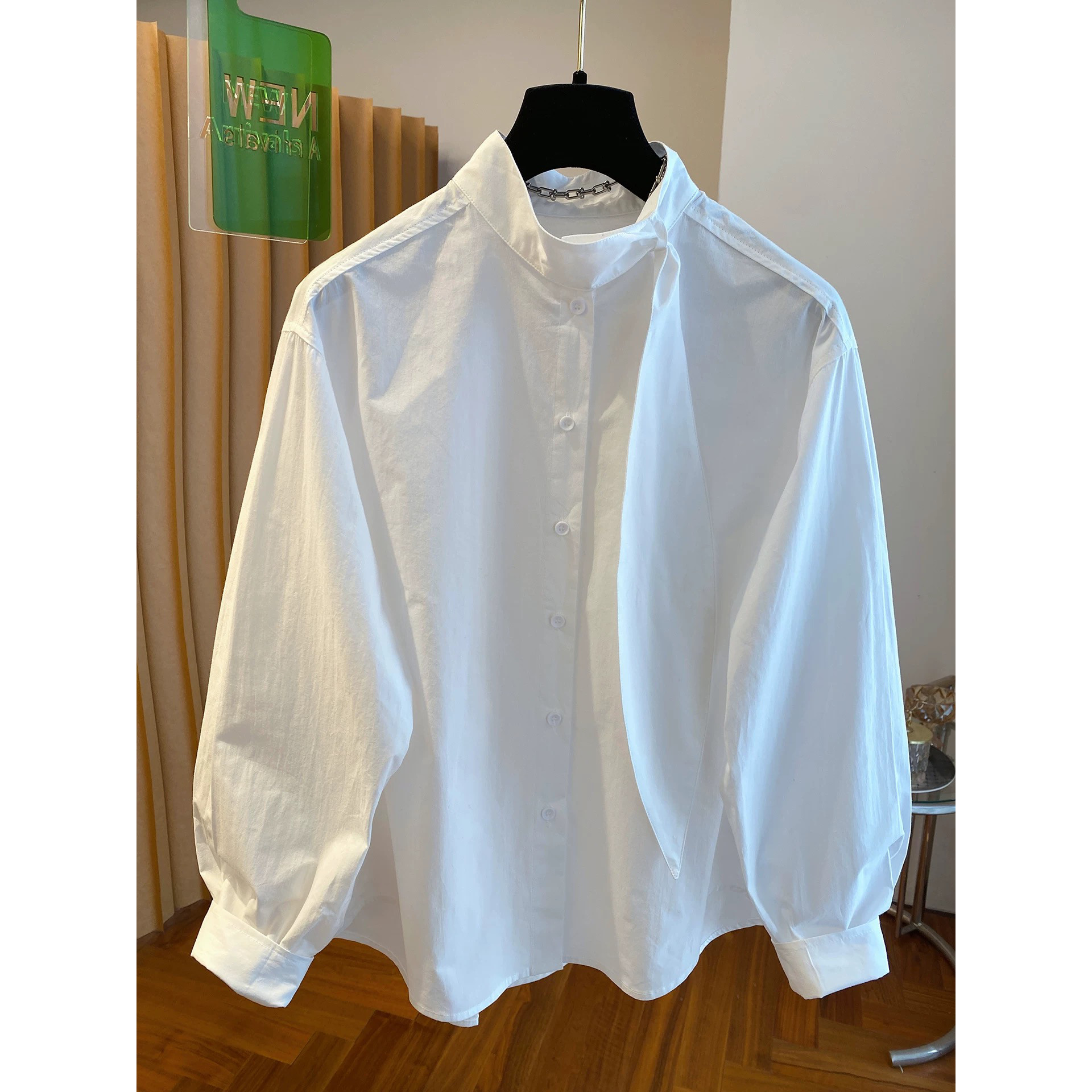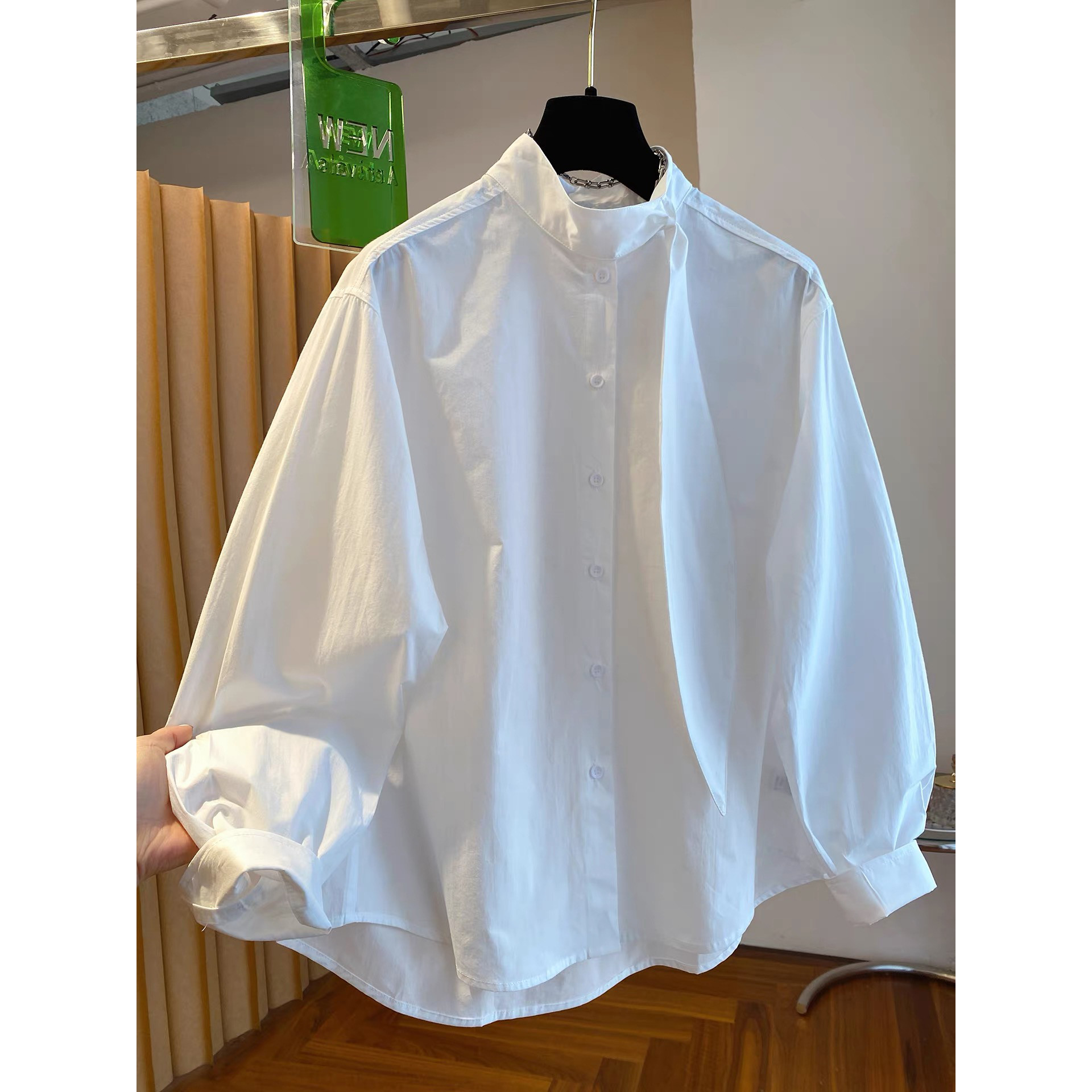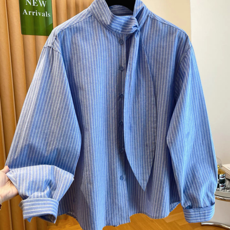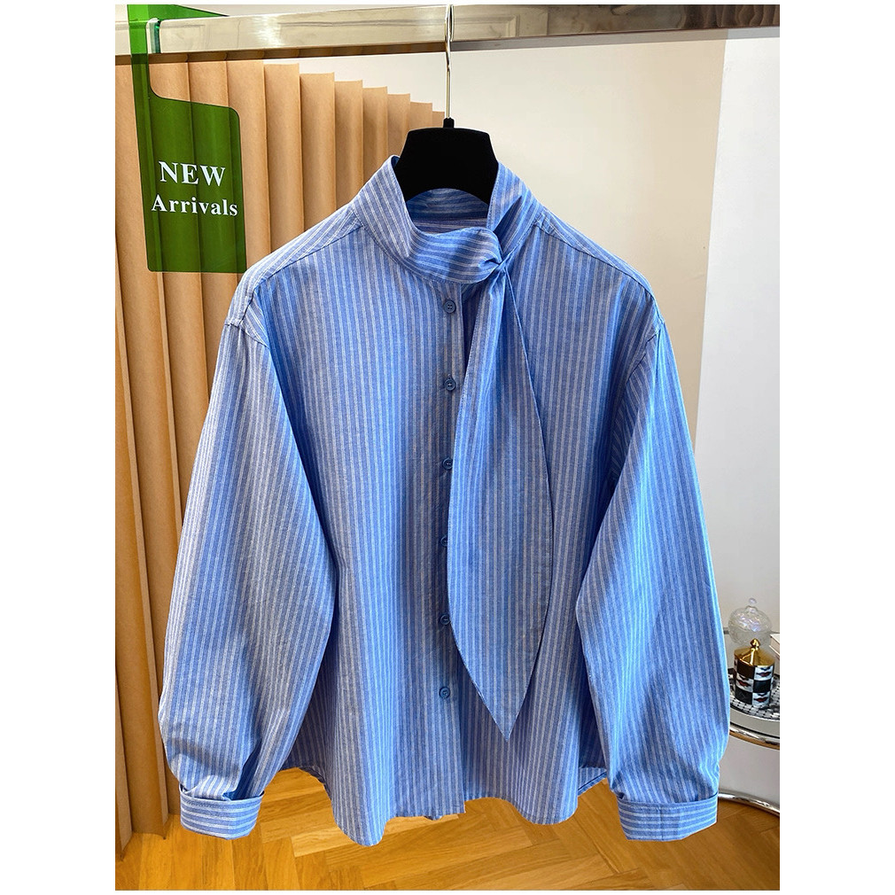 欧货高级感蓝色条纹飘带立领衬衫女春季气质休闲叠穿宽松长袖上衣