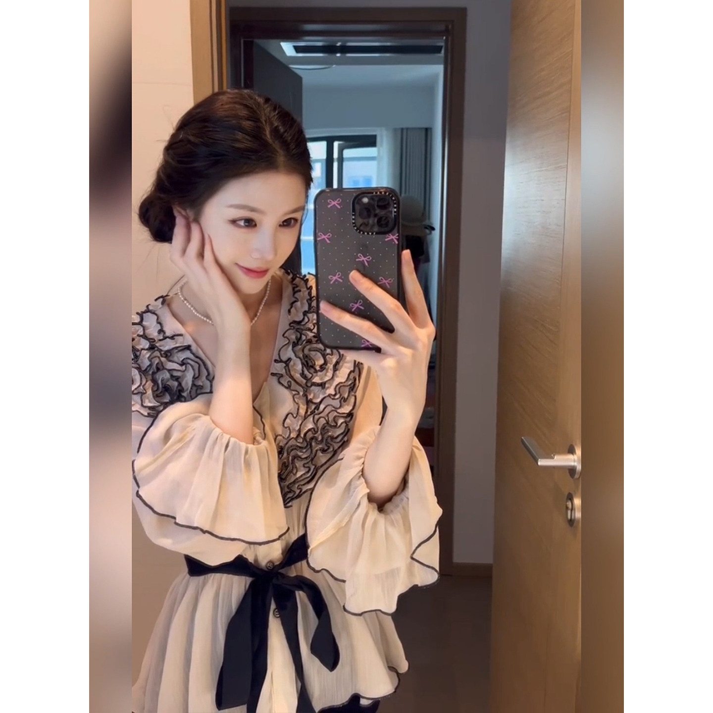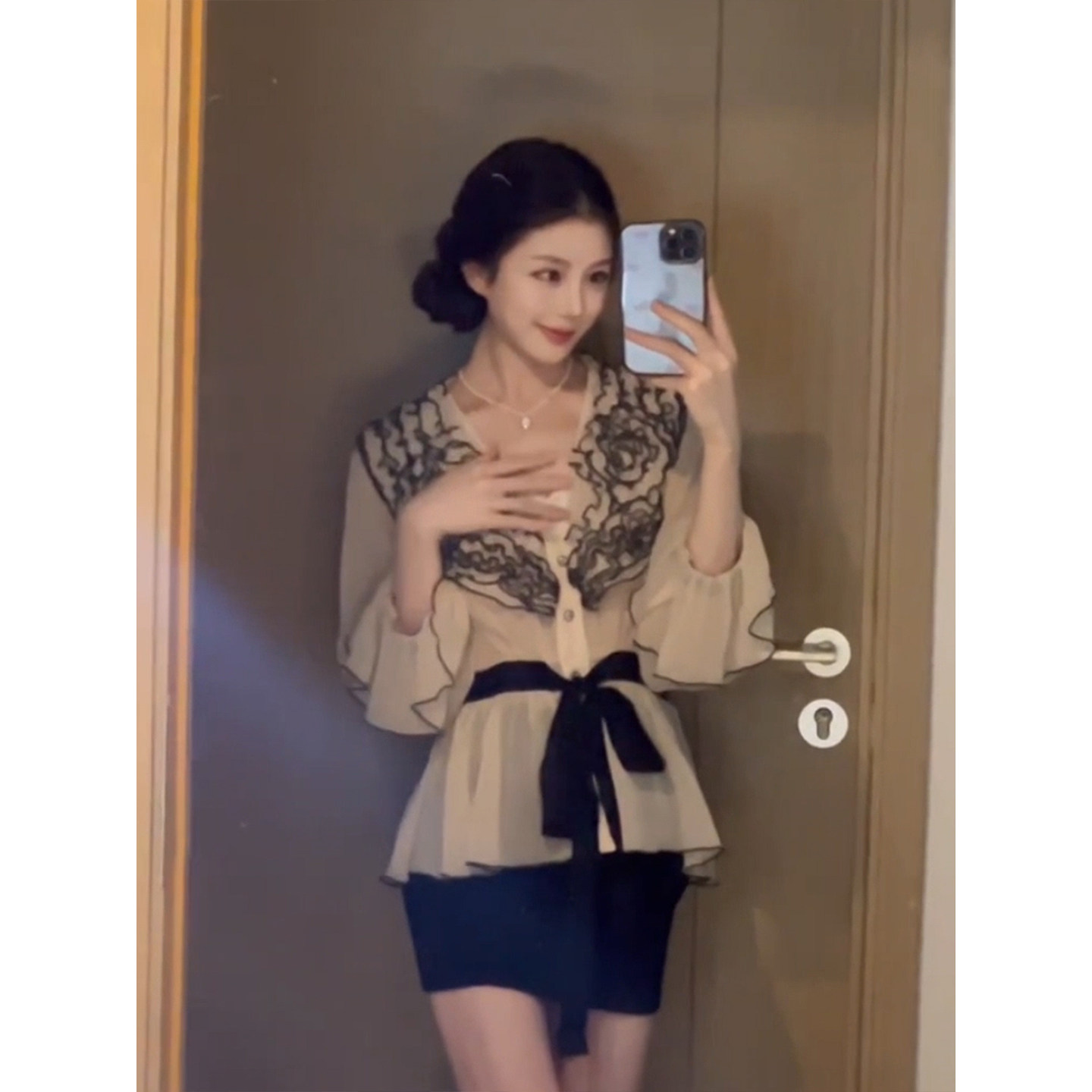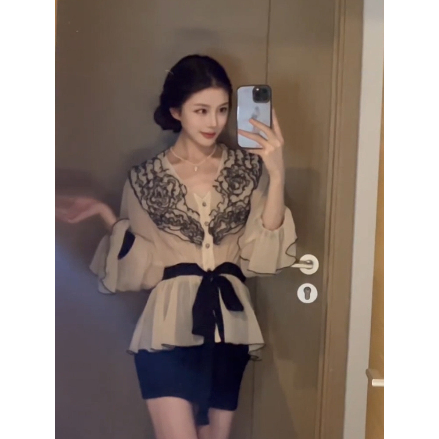 法式优雅撞色花边系带收腰衬衫