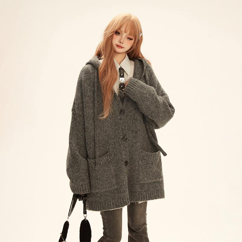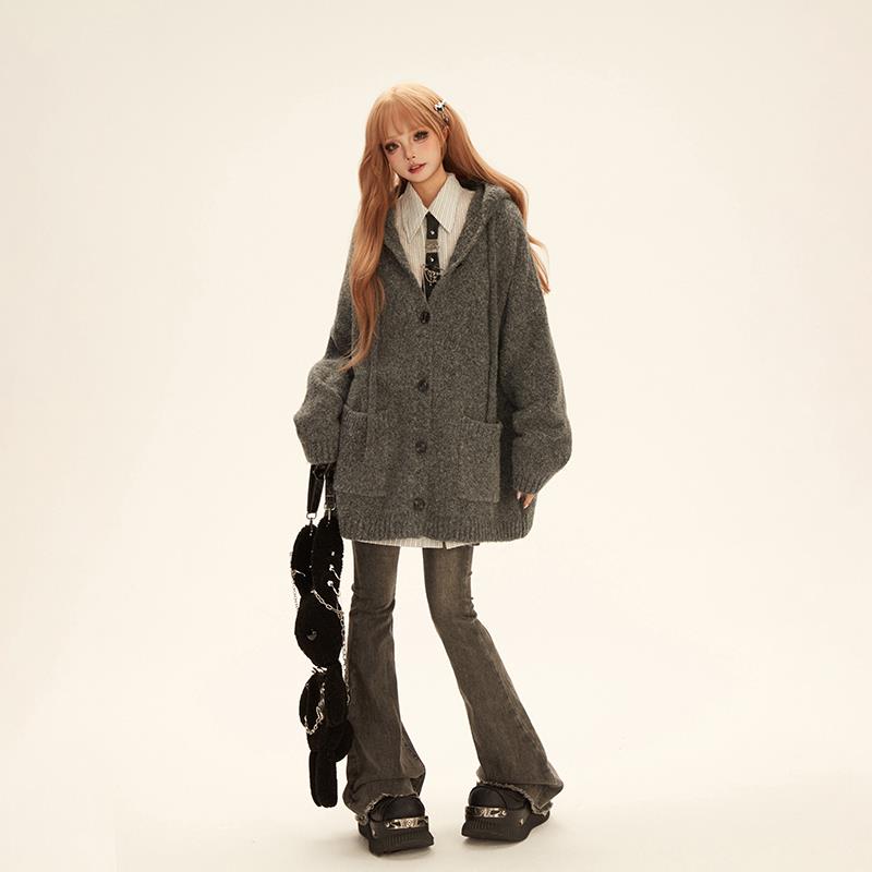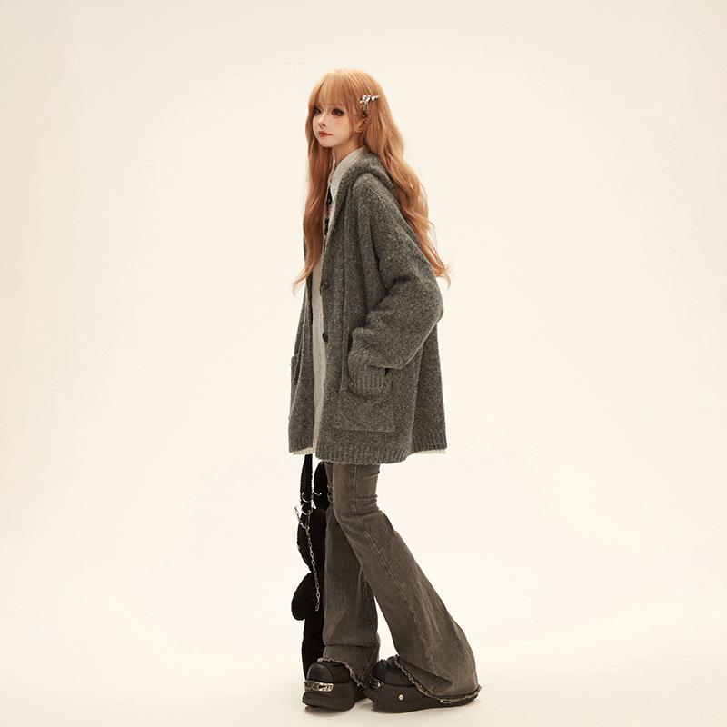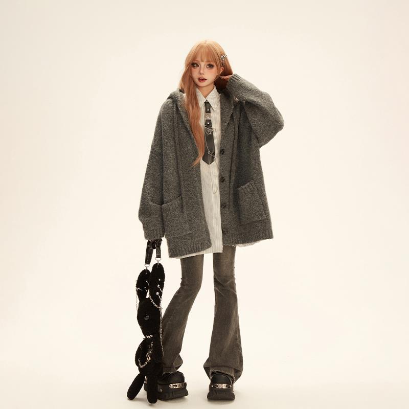 11SH97灰色慵懒风连帽毛衣女冬季宽松中长款加厚毛针织衫开衫外套